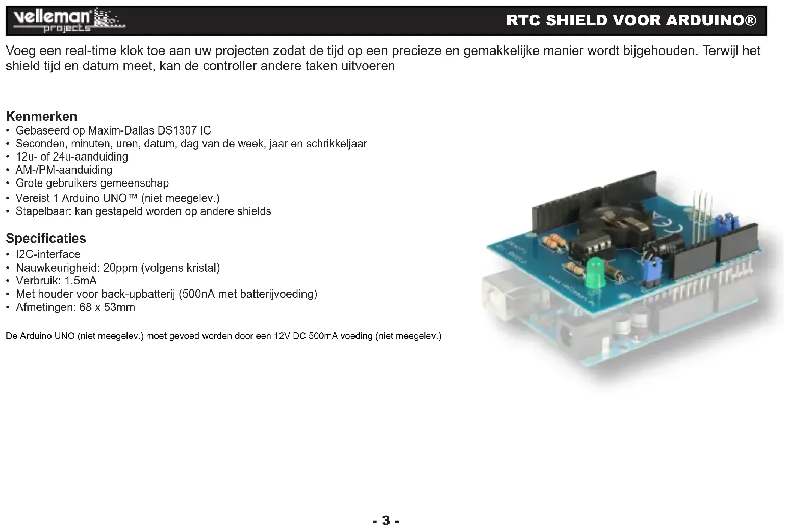 - Afmetingen: 68 x 53mm De Arduino UNO (niet meegelev.) moet gevoed worden door een 12V DC 500mA voeding (niet meegelev.)- 4 -