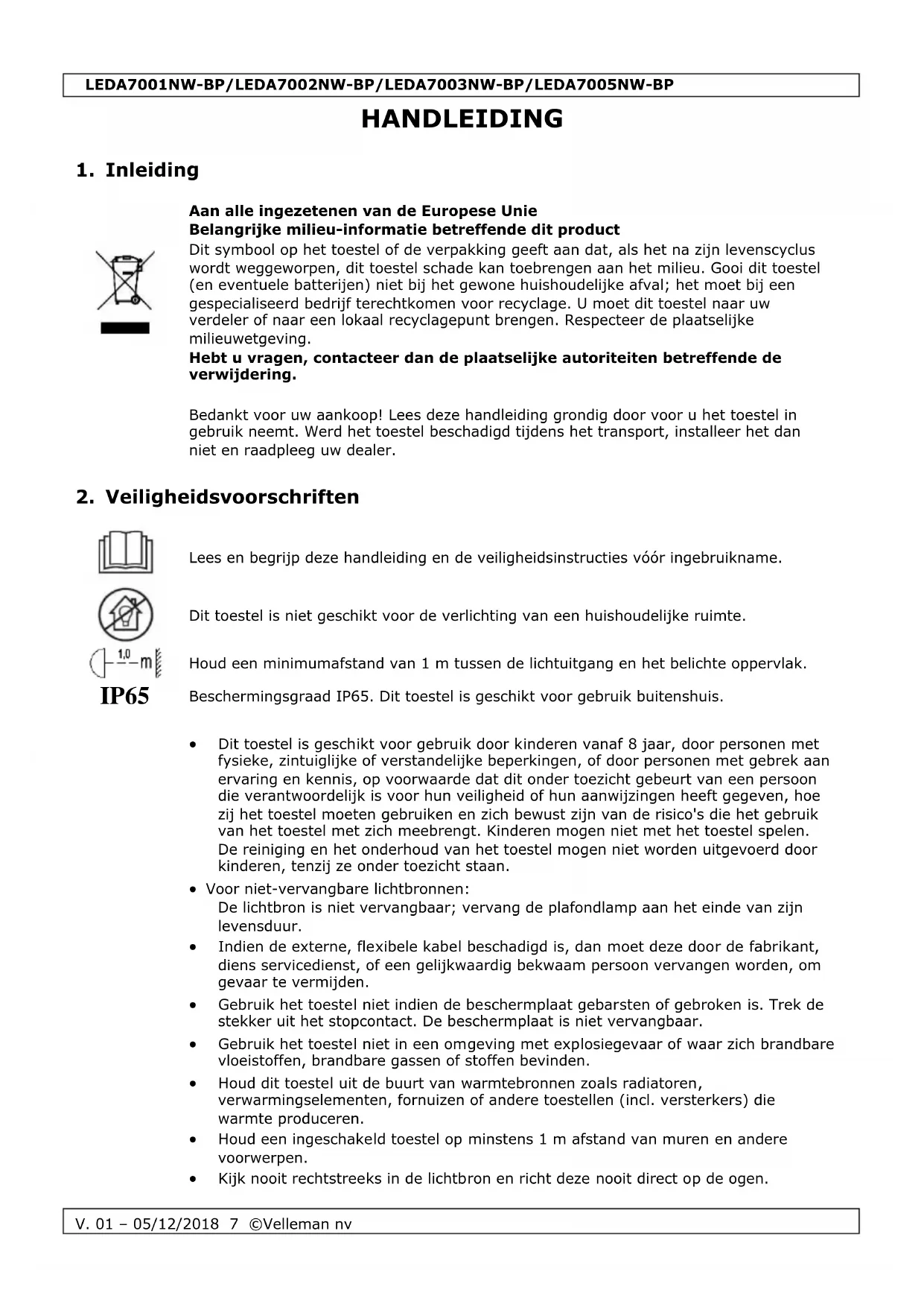 Velleman nv heeft het auteursrecht voor deze handleiding. Alle wereldwijde rechten voorbehouden. Het is niet toegestaan om deze handleiding of gedeelten ervan over te nemen, te kopiëren, te vertalen, te bewerken en op te slaan op een elektronisch medium zonder voorafgaande schriftelijke toestemming van de rechthebbende.LEDA7001NW-BP/LEDA7002NW-BP/LEDA7003NW-BP/LEDA7005NW-BP