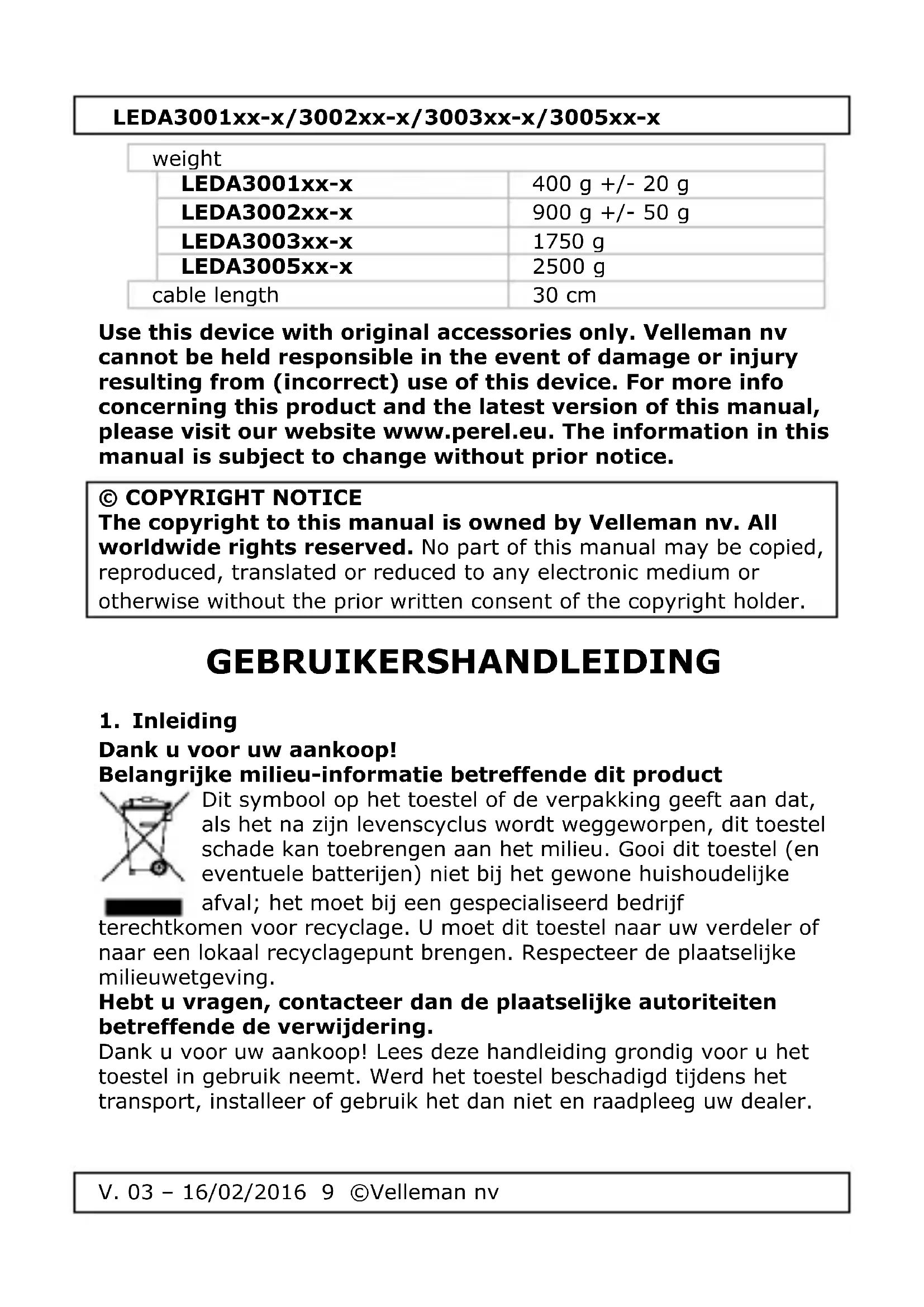 Gebruik dit toestel enkel met originele accessoires. Velleman nv is niet aansprakelijk voor schade of kwetsuren bij (verkeerd) gebruik van dit toestel. Voor meer informatie over dit product en de laatste versie van deze handleiding, zie www.perel.eu. De informatie in deze handleiding kan te allen tijde worden gewijzigd zonder voorafgaande kennisgeving. © AUTEURSRECHT Velleman nv heeft het auteursrecht voor deze handleiding. Alle wereldwijde rechten voorbehouden. Het is niet toegestaan om deze handleiding of gedeelten ervan over te nemen, te kopiëren, te vertalen, te bewerken en op te slaan op een elektronisch medium zonder voorafgaande schriftelijke toestemming van de rechthebbende.LEDA3001xx-x/3002xx-x/3003xx-x/3005xx-x