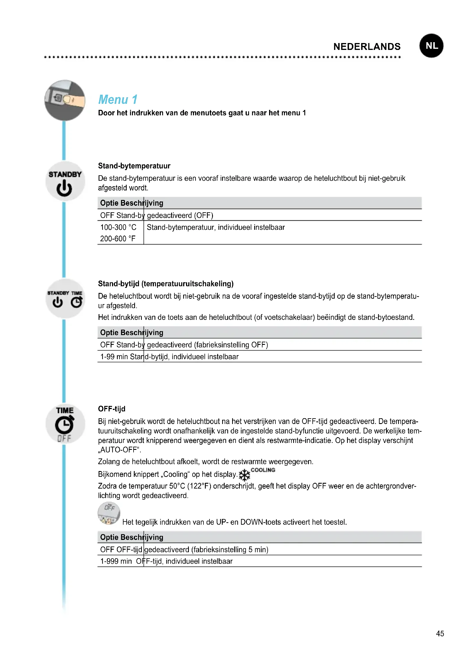 PORTUGUES45 Menu 1 Door het indrukken van de menutoets gaat u naar het menu 1 Stand-bytemperatuur De stand-bytemperatuur is een vooraf instelbare waarde waarop de heteluchtbout bij niet-gebruik afgesteld wordt. Optie Beschrijving OFF Stand-by gedeactiveerd (OFF) 100-300 °C 200-600 °F Stand-bytemperatuur, individueel instelbaar Stand-bytijd (temperatuuruitschakeling) De heteluchtbout wordt bij niet-gebruik na de vooraf ingestelde stand-bytijd op de stand-bytemperatu- ur afgesteld. Het indrukken van de toets aan de heteluchtbout (of voetschakelaar) beëindigt de stand-bytoestand. Optie Beschrijving OFF Stand-by gedeactiveerd (fabrieksinstelling OFF) 1-99 min Stand-bytijd, individueel instelbaar OFF-tijd Bij niet-gebruik wordt de heteluchtbout na het verstrijken van de OFF-tijd gedeactiveerd. De tempera- tuuruitschakeling wordt onafhankelijk van de ingestelde stand-byfunctie uitgevoerd. De werkelijke tem- peratuur wordt knipperend weergegeven en dient als restwarmte-indicatie. Op het display verschijnt „AUTO-OFF“. Zolang de heteluchtbout afkoelt, wordt de restwarmte weergegeven. Bijkomend knippert „Cooling“ op het display. Zodra de temperatuur 50°C (122°F) onderschrijdt, geeft het display OFF weer en de achtergrondver- lichting wordt gedeactiveerd. Het tegelijk indrukken van de UP- en DOWN-toets activeert het toestel. Optie Beschrijving OFF OFF-tijd gedeactiveerd (fabrieksinstelling 5 min) 1-999 min OFF-tijd, individueel instelbaar