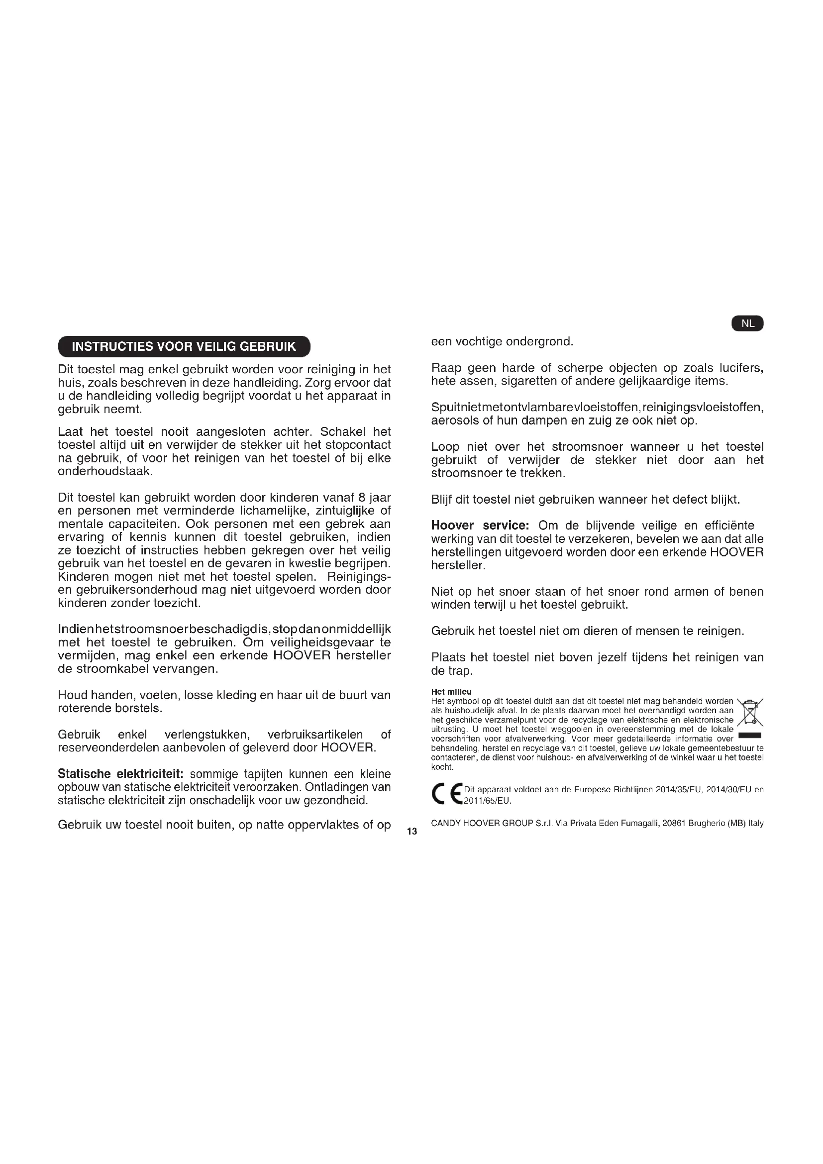 Dit toestel mag enkel gebruikt worden voor reiniging in het huis, zoals beschreven in deze handleiding. Zorg ervoor dat u de handleiding volledig begrijpt voordat u het apparaat in gebruik neemt. Laat het toestel nooit aangesloten achter. Schakel het toestel altijd uit en verwijder de stekker uit het stopcontact na gebruik, of voor het reinigen van het toestel of bij elke onderhoudstaak. Dit toestel kan gebruikt worden door kinderen vanaf 8 jaar en personen met verminderde lichamelijke, zintuiglijke of mentale capaciteiten. Ook personen met een gebrek aan ervaring of kennis kunnen dit toestel gebruiken, indien ze toezicht of instructies hebben gekregen over het veilig gebruik van het toestel en de gevaren in kwestie begrijpen. Kinderen mogen niet met het toestel spelen. Reinigings- en gebruikersonderhoud mag niet uitgevoerd worden door kinderen zonder toezicht. Indien het stroomsnoer beschadigd is, stop dan onmiddellijk met het toestel te gebruiken. Om veiligheidsgevaar te vermijden, mag enkel een erkende HOOVER hersteller de stroomkabel vervangen. Houd handen, voeten, losse kleding en haar uit de buurt van roterende borstels. Gebruik enkel verlengstukken, verbruiksartikelen of reserveonderdelen aanbevolen of geleverd door HOOVER. Statische elektriciteit: sommige tapijten kunnen een kleine opbouw van statische elektriciteit veroorzaken. Ontladingen van statische elektriciteit zijn onschadelijk voor uw gezondheid. Gebruik uw toestel nooit buiten, op natte oppervlaktes of op een vochtige ondergrond. Raap geen harde of scherpe objecten op zoals lucifers, hete assen, sigaretten of andere gelijkaardige items. Spuit niet met ontvlambare vloeistoffen, reinigingsvloeistoffen, aerosols of hun dampen en zuig ze ook niet op. Loop niet over het stroomsnoer wanneer u het toestel gebruikt of verwijder de stekker niet door aan het stroomsnoer te trekken. Blijf dit toestel niet gebruiken wanneer het defect blijkt. Hoover service: Om de blijvende veilige en efciënte werking van dit toestel te verzekeren, bevelen we aan dat alle herstellingen uitgevoerd worden door een erkende HOOVER hersteller. Niet op het snoer staan of het snoer rond armen of benen winden terwijl u het toestel gebruikt. Gebruik het toestel niet om dieren of mensen te reinigen. Plaats het toestel niet boven jezelf tijdens het reinigen van de trap. Het milieu Het symbool op dit toestel duidt aan dat dit toestel niet mag behandeld worden als huishoudelijk afval. In de plaats daarvan moet het overhandigd worden aan het geschikte verzamelpunt voor de recyclage van elektrische en elektronische uitrusting. U moet het toestel weggooien in overeenstemming met de lokale voorschriften voor afvalverwerking. Voor meer gedetailleerde informatie over behandeling, herstel en recyclage van dit toestel, gelieve uw lokale gemeentebestuur te contacteren, de dienst voor huishoud- en afvalverwerking of de winkel waar u het toestel kocht. Dit apparaat voldoet aan de Europese Richtlijnen 2014/35/EU, 2014/30/EU en 2011/65/EU. CANDY HOOVER GROUP S.r.l. Via Privata Eden Fumagalli, 20861 Brugherio (MB) Italy NL14 *Alleen bepaalde modellen **Mondstukontwerp kan varieren volgens modellen