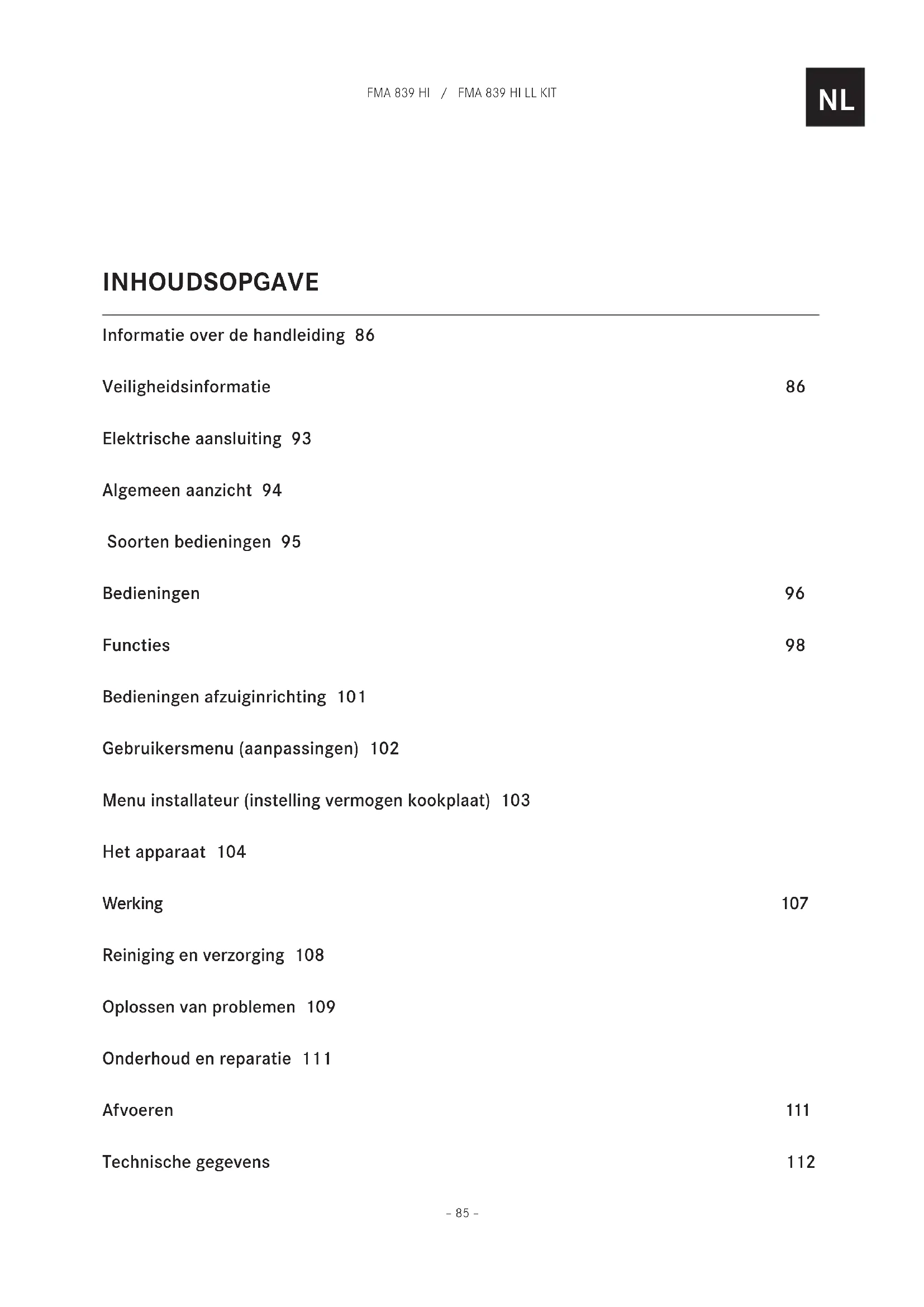 – 85 – Informatie over de handleiding 86 Veiligheidsinformatie 86 Elektrische aansluiting 93 Algemeen aanzicht 94 Soorten bedieningen 95 Bedieningen 96 Functies 98 Bedieningen afzuiginrichting 101 Gebruikersmenu (aanpassingen) 102 Menu installateur (instelling vermogen kookplaat) 103 Het apparaat 104 Werking 107 Reiniging en verzorging 108 Oplossen van problemen 109 Onderhoud en reparatie 111 Af voeren 111 Technische gegevens 112 INHOUDSOPGAVENL