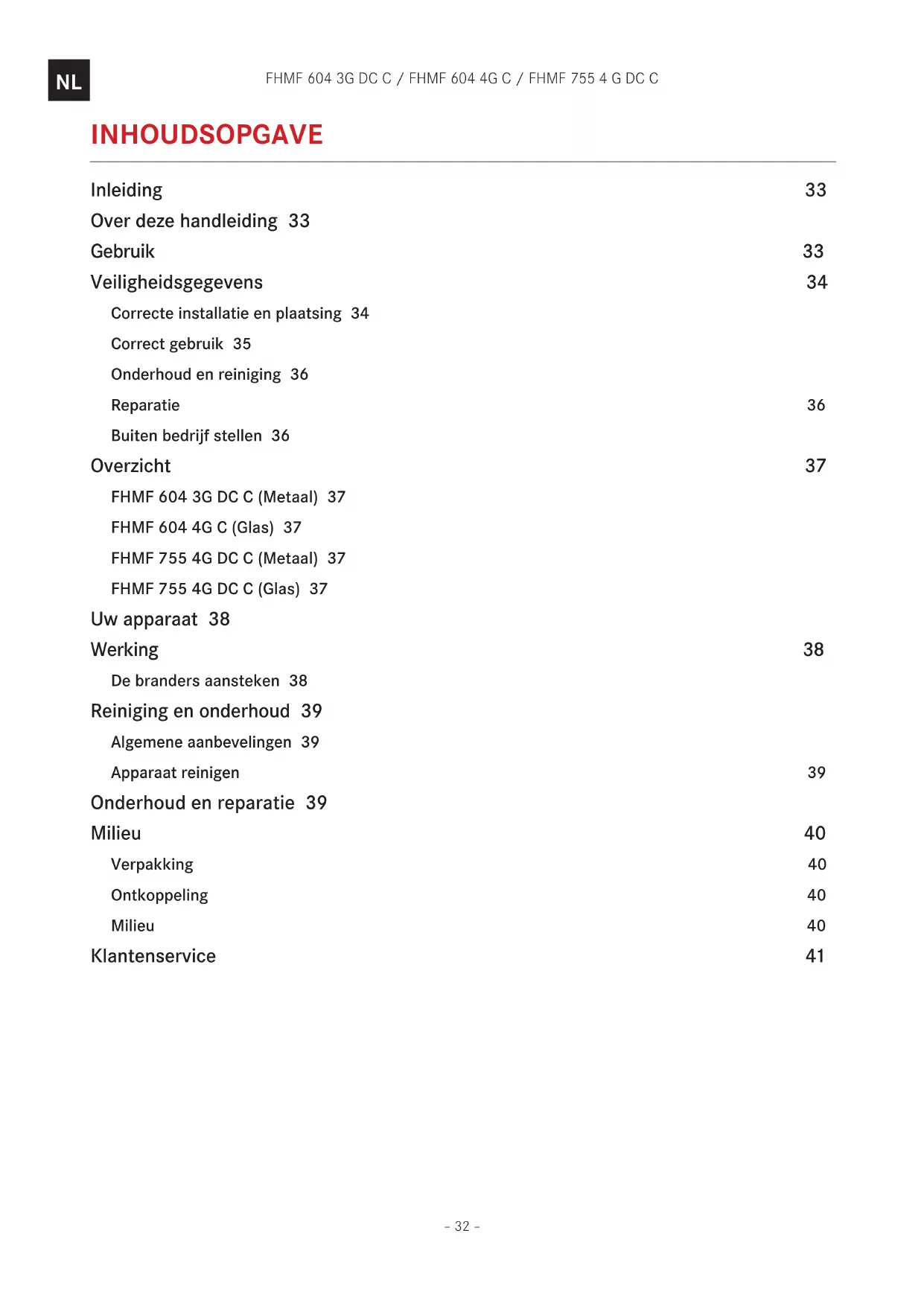 INHOUDSOPGAVE Inleiding 33 Over deze handleiding 33 Gebruik 33 Veiligheidsgegevens 34 Correcte installatie en plaatsing 34 Correct gebruik 35 Onderhoud en reiniging 36 Reparatie 36 Buiten bedrijf stellen 36 Overzicht 37 FHMF 604 3G DC C (Metaal) 37 FHMF 604 4G C (Glas) 37 FHMF 755 4G DC C (Metaal) 37 FHMF 755 4G DC C (Glas) 37 Uw apparaat 38 Werking 38 De branders aansteken 38 Reiniging en onderhoud 39 Algemene aanbevelingen 39 Apparaat reinigen 39 Onderhoud en reparatie 39 Milieu 40 Verpakking 40 Ontkoppeling 40 Milieu 40 Klantenservice 41– 33 – FHMF 604 3G DC C / FHMF 604 4G C / FHMF 755 4 G DC C