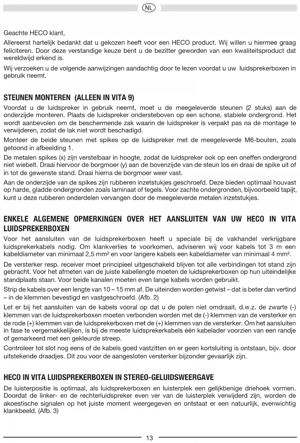 12Geachte HECO klant, Allereerst hartelijk bedankt dat u gekozen heeft voor een HECO product. Wij willen u hiermee graag feliciteren. Door deze verstandige keuze bent u de bezitter geworden van een kwaliteitsproduct dat wereldwijd erkend is. Wij verzoeken u de volgende aanwijzingen aandachtig door te lezen voordat u uw luidsprekerboxen in gebruik neemt. STEUNEN MONTEREN (ALLEEN IN VITA 9) Voordat u de luidspreker in gebruik neemt, moet u de meegeleverde steunen (2 stuks) aan de onderzijde monteren. Plaats de luidspreker ondersteboven op een schone, stabiele ondergrond. Het wordt aanbevolen om de beschermende zak waarin de luidspreker is verpakt pas na de montage te verwijderen, zodat de lak niet wordt beschadigd. Monteer de beide steunen met spikes op de luidspreker met de meegeleverde M6-bouten, zoals getoond in afbeelding 1. De metalen spikes (x) zijn verstelbaar in hoogte, zodat de luidspreker ook op een oneffen ondergrond niet wiebelt. Draai hiervoor de borgmoer (y) aan de bovenzijde van de steun los en draai de spike uit of in tot de gewenste stand. Draai hierna de borgmoer weer vast. Aan de onderzijde van de spikes zijn rubberen inzetstukjes geschroefd. Deze bieden optimaal houvast op harde, gladde ondergronden zoals laminaat of tegels. Voor zachte ondergronden, bijvoorbeeld tapijt, kunt u deze rubberen onderdelen vervangen door de meegeleverde metalen inzetstukjes. ENKELE ALGEMENE OPMERKINGEN OVER HET AANSLUITEN VAN UW HECO IN VITA LUIDSPREKERBOXEN Voor het aansluiten van de luidsprekerboxen heeft u speciale bij de vakhandel verkrijgbare luidsprekerkabels nodig. Om klankverlies te voorkomen, adviseren wij voor kabels tot 3 m een kabeldiameter van minimaal 2,5 mm² en voor langere kabels een kabeldiameter van minimaal 4 mm². De versterker resp. receiver moet principieel uitgeschakeld blijven tot alle verbindingen tot stand zijn gebracht. Voor het afmeten van de juiste kabellengte moeten de luidsprekerboxen op hun uiteindelijke standplaats staan. Voor beide kanalen moeten even lange kabels worden gebruikt. Strip de kabels over een lengte van 10 – 15 mm af. De uiteinden worden getwist – dat is beter dan vertind – in de klemmen bevestigd en vastgeschroefd. (Afb. 2) Let er bij het aansluiten van de kabels vooral op dat u de polen niet omdraait, d.w.z. de zwarte (-) klemmen van de luidsprekerboxen moeten verbonden worden met de (-) klemmen van de versterker en de rode (+) klemmen van de luidsprekerboxen met de (+) klemmen van de versterker. Om het aansluiten in fase te vergemakkelijken, is bij de meeste luidsprekerkabels één kabelader voorzien van een randje of gemarkeerd met een gekleurde streep. Controleer tot slot nog eens of de kabels goed vastzitten en er geen kortsluiting is ontstaan, bijv. door uitstekende draadjes. Dit zou voor de aangesloten versterker bijzonder gevaarlijk zijn.