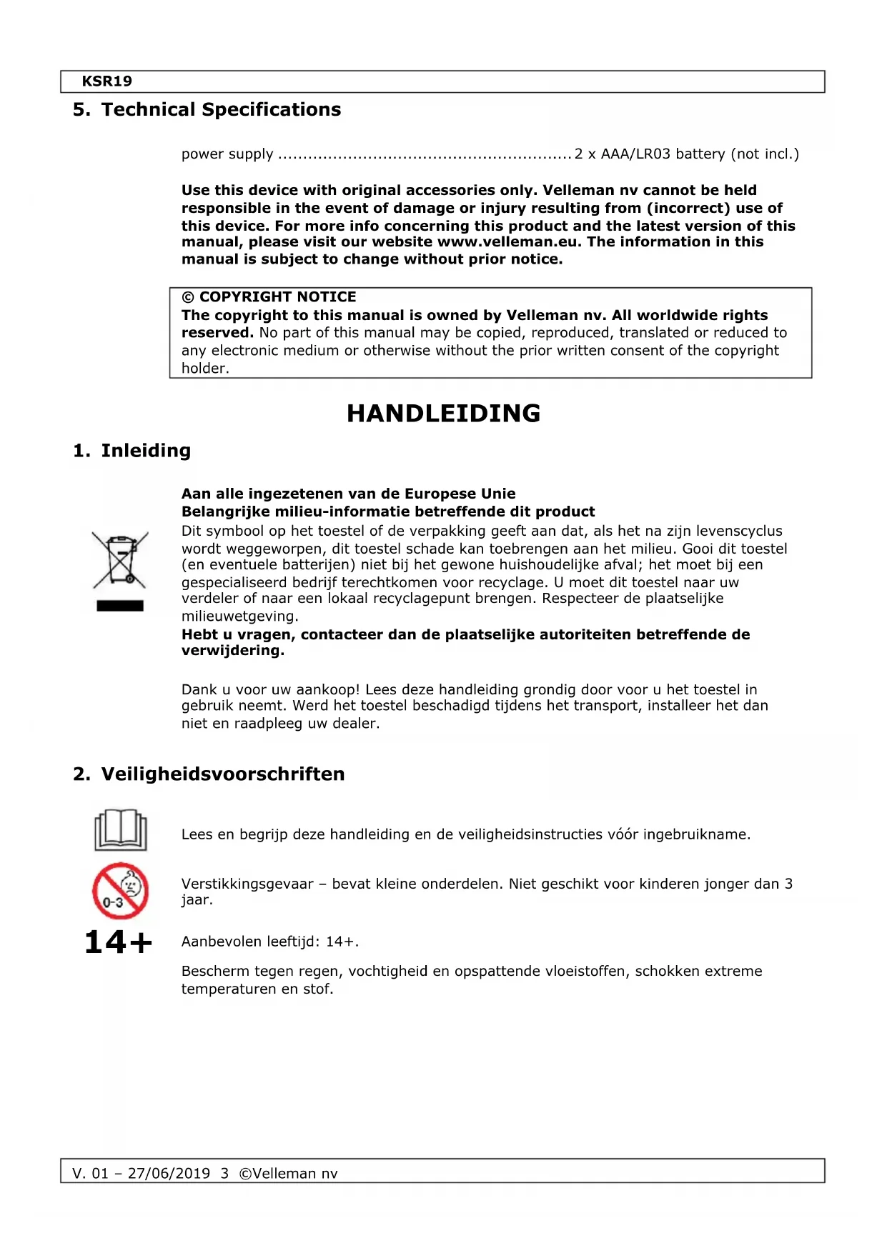 V. 01 – 27/06/2019 4 ©Velleman nv