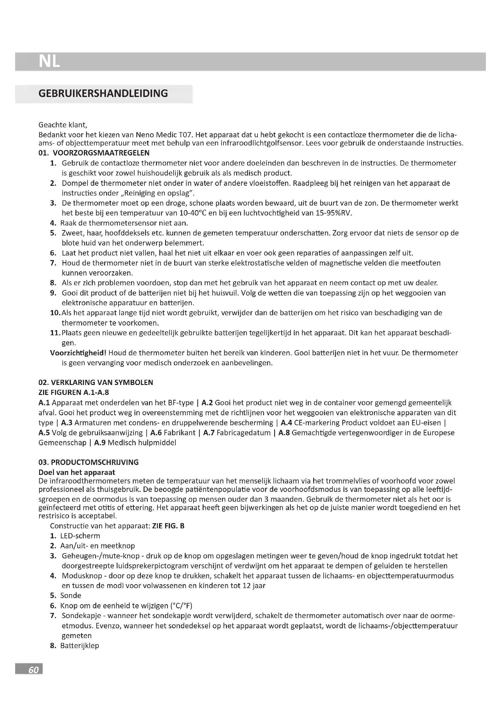 GEBRUIKERSHANDLEIDING Geachteklant, BedanktvoorhetkiezenvanNenoMedicT07.Hetapparaatdatuhebtgekochtiseencontactlozethermometerdiedelicha- ams-ofobjecemperatuurmeetmetbehulpvaneeninfraroodlichtgolfsensor.Leesvoorgebruikdeonderstaandeinstruces.