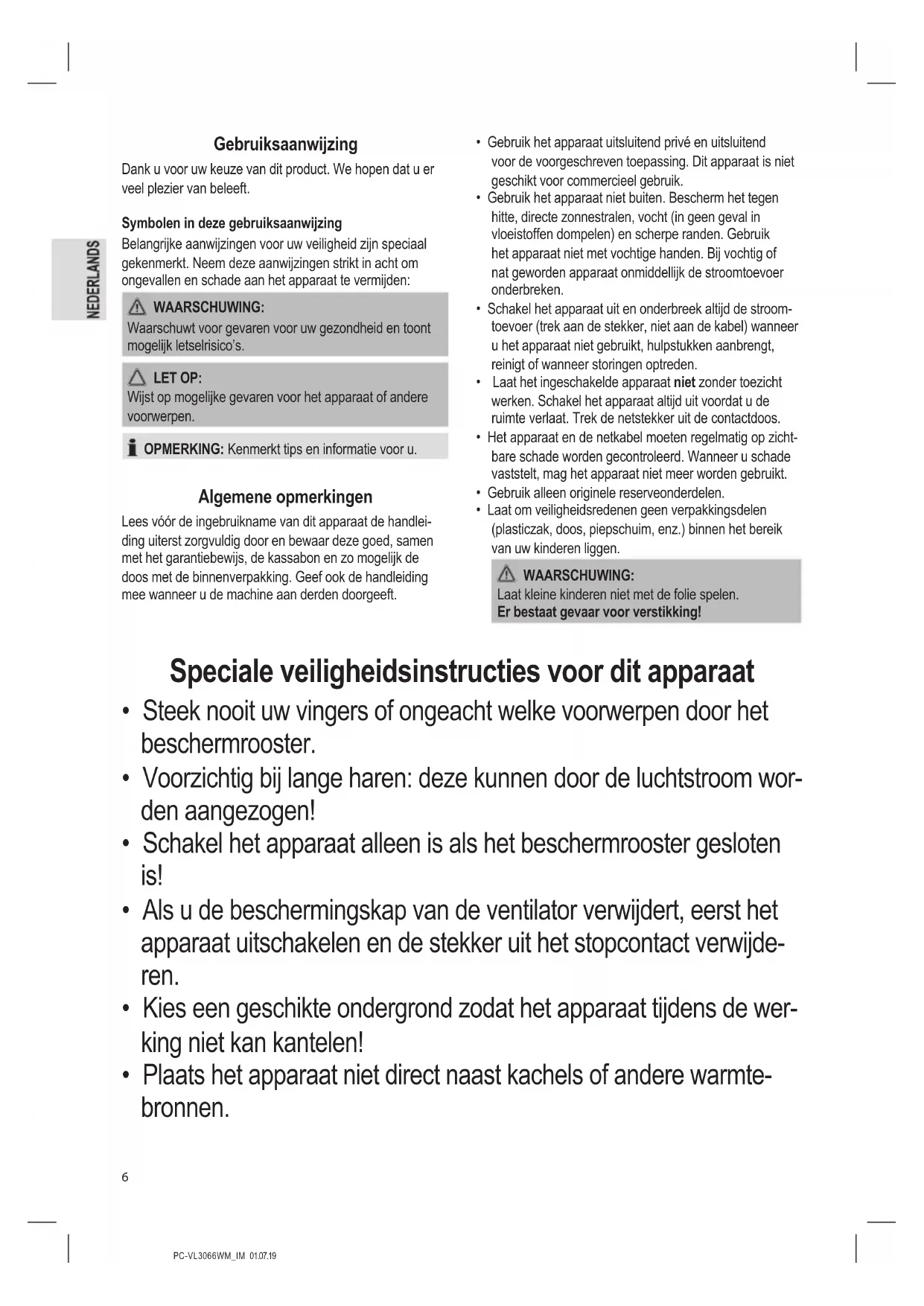 - Laat om veiligheidsredenen geen verpakkingsdelen (plasticzak, doos, piepschuim, enz.) binnen het bereik van uw kinderen liggen. WAARSCHUWING: Laat kleine kinderen niet met de folie spelen. Er bestaat gevaar voor verstikking! Speciale veiligheidsinstructies voor dit apparaat