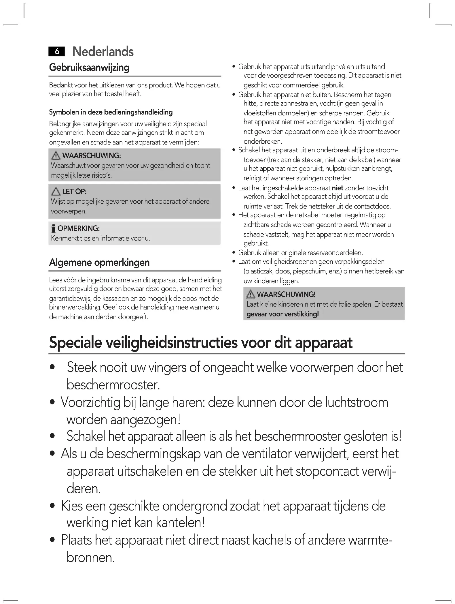 - Steek nooit uw vingers of ongeacht welke voorwerpen door het beschermrooster.