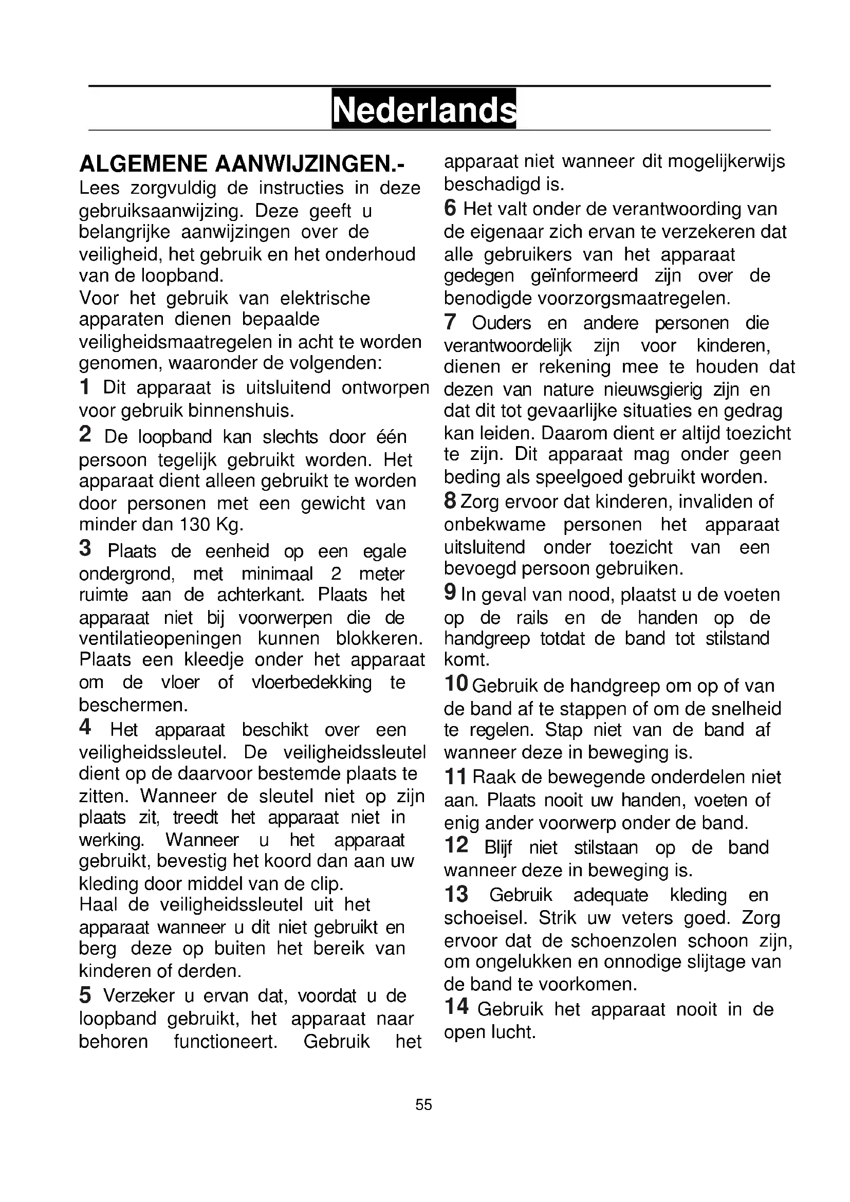 Nederlands ALGEMENE AANWIJZINGEN.- Lees zorgvuldig de instructies in deze gebruiksaanwijzing. Deze geeft u belangrijke aanwijzingen over de veiligheid, het gebruik en het onderhoud van de loopband. Voor het gebruik van elektrische apparaten dienen bepaalde veiligheidsmaatregelen in acht te worden genomen, waaronder de volgenden: