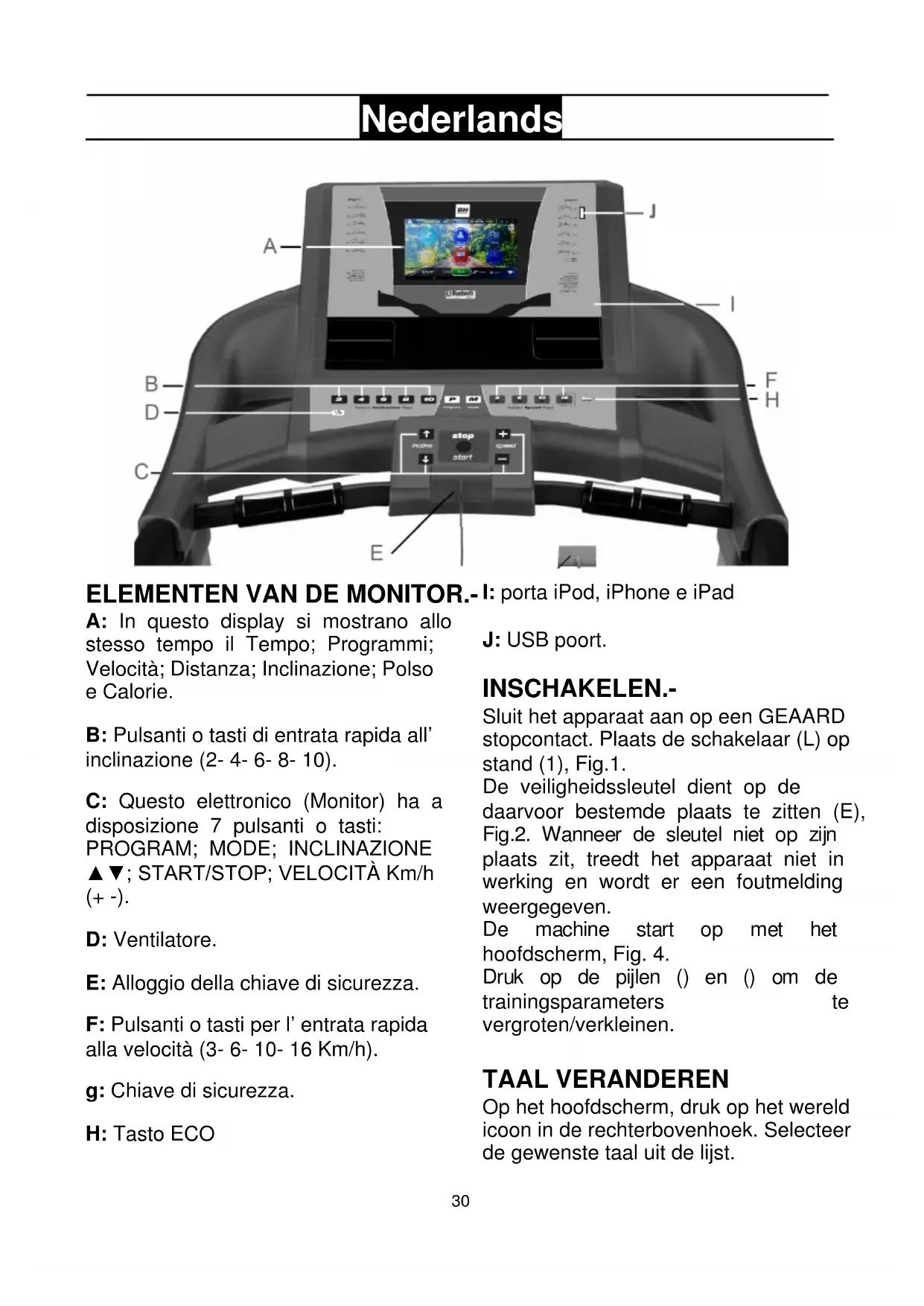 D: Ventilatore. E: Alloggio della chiave di sicurezza. F: Pulsanti o tasti per l’ entrata rapida alla velocità (3- 6- 10- 16 Km/h). g: Chiave di sicurezza. H: Tasto ECO I: porta iPod, iPhone e iPad J: USB poort. INSCHAKELEN.- Sluit het apparaat aan op een GEAARD stopcontact. Plaats de schakelaar (L) op stand (1), Fig.1. De veiligheidssleutel dient op de daarvoor bestemde plaats te zitten (E), Fig.2. Wanneer de sleutel niet op zijn plaats zit, treedt het apparaat niet in werking en wordt er een foutmelding weergegeven. De machine start op met het hoofdscherm, Fig. 4. Druk op de pijlen () en () om de trainingsparameters te vergroten/verkleinen. TAAL VERANDEREN Op het hoofdscherm, druk op het wereld icoon in de rechterbovenhoek. Selecteer de gewenste taal uit de lijst.31
