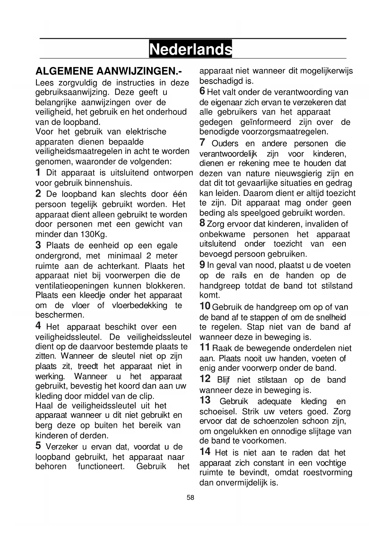 De loopband kan slechts door één persoon tegelijk gebruikt worden. Het apparaat dient alleen gebruikt te worden door personen met een gewicht van minder dan 130Kg.