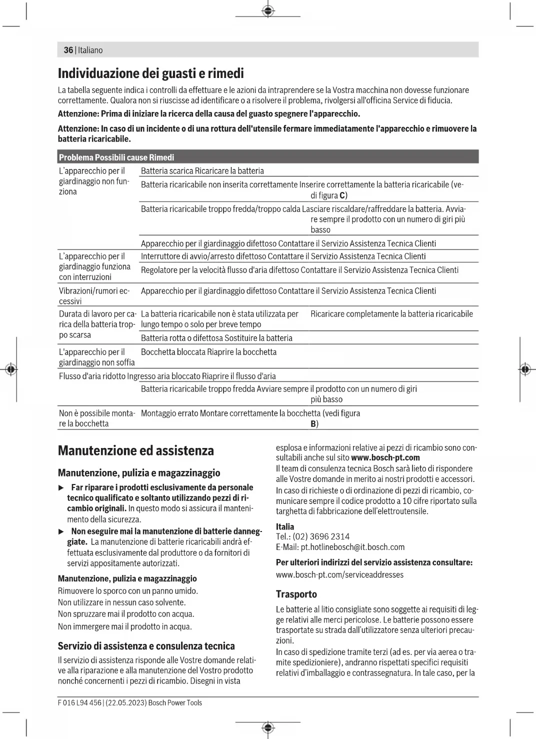 Manutenzione ed assistenza Manutenzione, pulizia e magazzinaggio u Far riparare i prodotti esclusivamente da personale tecnico qualificato e soltanto utilizzando pezzi di ri- cambio originali. In questo modo si assicura il manteni- mento della sicurezza. u Non eseguire mai la manutenzione di batterie danneg- giate. La manutenzione di batterie ricaricabili andrà ef- fettuata esclusivamente dal produttore o da fornitori di servizi appositamente autorizzati. Manutenzione, pulizia e magazzinaggio Rimuovere lo sporco con un panno umido. Non utilizzare in nessun caso solvente. Non spruzzare mai il prodotto con acqua. Non immergere mai il prodotto in acqua. Servizio di assistenza e consulenza tecnica Il servizio di assistenza risponde alle Vostre domande relati- ve alla riparazione e alla manutenzione del Vostro prodotto nonché concernenti i pezzi di ricambio. Disegni in vista esplosa e informazioni relative ai pezzi di ricambio sono con- sultabili anche sul sito www.bosch-pt.com Il team di consulenza tecnica Bosch sarà lieto di rispondere alle Vostre domande in merito ai nostri prodotti e accessori. In caso di richieste o di ordinazione di pezzi di ricambio, co- municare sempre il codice prodotto a 10cifre riportato sulla targhetta di fabbricazione dell’elettroutensile. Italia Tel.: (02) 3696 2314 E-Mail: pt.hotlinebosch@it.bosch.com Per ulteriori indirizzi del servizio assistenza consultare: www.bosch-pt.com/serviceaddresses Trasporto Le batterie al litio consigliate sono soggette ai requisiti di leg- ge relativi alle merci pericolose. Le batterie possono essere trasportate su strada dall’utilizzatore senza ulteriori precau- zioni. In caso di spedizione tramite terzi (ad es. per via aerea o tra- mite spedizioniere), andranno rispettati specifici requisiti relativi d’imballaggio e contrassegnatura. In tale caso, per la F 016 L94 456 | (22.05.2023) Bosch Power ToolsNederlands | 37 preparazione dell’articolo da spedire, andrà consultato uno specialista in merci pericolose. Inviare le batterie soltanto se la relativa carcassa non è dan- neggiata. Coprire con nastro adesivo i contatti scoperti ed imballare la batteria in modo che non possa spostarsi nell’imballaggio. Andranno altresì rispettate eventuali ulte- riori norme nazionali complementari. Smaltimento Avviare ad un riciclaggio rispettoso dell’am- biente prodotti, batterie ricaricabili, accessori ed imballaggi non più impiegabili. Non gettare prodotti e batterie ricaricabili/pile tra i rifiuti domestici! Solo per i Paesi UE: Conformemente alla direttiva europea 2012/19/UE i pro- dotti diventati inservibili e, in base alla direttiva europea 2006/66/CE, le batterie ricaricabili/pile difettose o consu- mate devono essere raccolte separatamente ed essere invia- te ad una riutilizzazione ecologica. In caso di smaltimento improprio, le apparecchiature elettri- che ed elettroniche potrebbero avere effetti nocivi sull'am- biente e sulla salute umana a causa della possibile presenza di sostanze nocive. Batterie/pile: Per le batterie al litio: Attenersi alle avvertenze riportate al paragrafo «Trasporto» (vedi «Trasporto», Pagina36). Nederlands Veiligheidsvoorschriften Verklaring van de symbolen op het tuingereedschap Algemene waarschuwing. Lees de gebruiksaanwijzing. Niet in de regen gebruiken. WAARSCHUWING: Pas op voor weggeslinger- de delen. WAARSCHUWING: Houd omstanders uit de buurt. Kom met uw handen, voeten of ruime kleding niet in de openingen terwijl het product loopt. Roterende blazer. Kom met uw handen, voe- ten, lang haar of ruime kleding niet in de ope- ningen terwijl het product loopt. Draag een veiligheidsbril en gehoorbescher- ming. WAARSCHUWING: Verwijder de accu vóór on- derhoudswerkzaamheden. Algemene veiligheidswaarschuwingen voor elektrische gereedschappen WAARSCHU- WING Lees alle waarschuwingen, veilig- heidsaanwijzingen, afbeeldingen en specificaties die bij dit elektri- sche gereedschap worden geleverd. Als de hieronder ver- melde aanwijzingen niet worden opgevolgd, kan dit een elek- trische schok, brand en/of ernstig letsel tot gevolg hebben. Bewaar alle waarschuwingen en voorschriften voor toe- komstig gebruik. Het in de waarschuwingen gebruikte begrip elektrisch ge- reedschap heeft betrekking op elektrische gereedschappen voor gebruik op het stroomnet (met netsnoer) en op elektri- sche gereedschappen voor gebruik met een accu (zonder netsnoer). Veiligheid van de werkomgeving u Houd uw werkomgeving schoon en goed verlicht. Een rommelige of onverlichte werkomgeving kan tot ongeval- len leiden. u Houd kinderen en andere personen tijdens het ge- bruik van het elektrische gereedschap uit de buurt. Wanneer u wordt afgeleid, kunt u de controle over het ge- reedschap verliezen. u Tijdens het gebruik mogen zich binnen een straal van 3 meter geen andere personen of dieren ophouden. Vuil mag nooit in de richting van personen in de buurt worden geblazen. u Let bij het gebruik van het product op gevaren die niet hoorbaar zijn. u Let op dat u niet over het gereedschap struikelt nadat u het op de grond heeft gezet. u De bediener is verantwoordelijk voor ongevallen, per- soonlijk letsel of schade aan het eigendom van ande- ren. Elektrische veiligheid u Voorkom aanraking van het lichaam met geaarde op- pervlakken, bijvoorbeeld van buizen, verwarmingen, Bosch Power Tools F 016 L94 456 | (22.05.2023)38 | Nederlands fornuizen en koelkasten. Er bestaat een verhoogd risico op een elektrische schok, wanneer uw lichaam geaard is. u Houd het elektrische gereedschap uit de buurt van re- gen of natheid. Het binnendringen van water in het elek- trische gereedschap vergroot het risico van een elektri- sche schok. u Gebruik het product niet bij slechte weersomstandig- heden, met name niet bij kans op onweer. Veiligheid van personen u Wees alert, let goed op wat u doet en ga met verstand te werk bij het gebruik van het elektrische gereed- schap. Gebruik geen elektrisch gereedschap, wan- neer u moe bent of onder invloed staat van dru