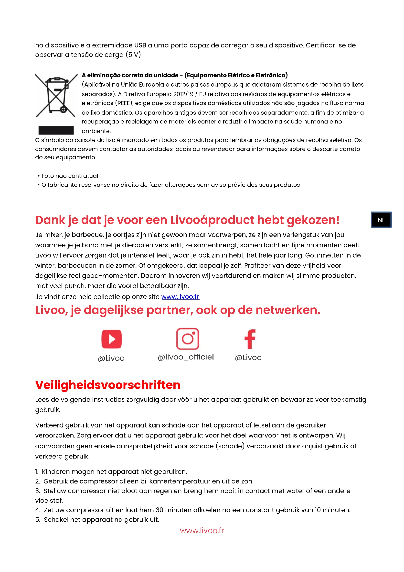 Dank je dat je voor een Livoo-product hebt gekozen! Je mixer, je barbecue, je oortjes zijn niet gewoon maar voorwerpen, ze zijn een verlengstuk van jou waarmee je je band met je dierbaren versterkt, ze samenbrengt, samen lacht en fijne momenten deelt. Livoo wil ervoor zorgen dat je intensief leeft, waar je ook zin in hebt, het hele jaar lang. Gourmetten in de winter, barbecueën in de zomer. Of omgekeerd, dat bepaal je zelf. Profiteer van deze vrijheid voor dagelijkse feel good-momenten. Daarom innoveren wij voortdurend en maken wij slimme producten, met veel punch, maar die vooral betaalbaar zijn. Je vindt onze hele collectie op onze site www.livoo.fr Livoo, je dagelijkse partner, ook op de netwerken.