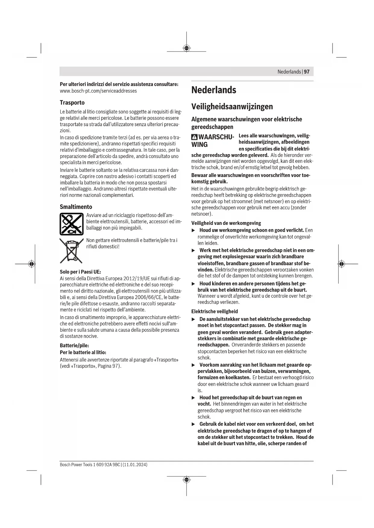 45°; 30°; 22,5°; 15° 15°; 22,5°; 30°; 45° – Allentare il pomello di fissaggio (16), qualora sia serrato. – Estrarre la levetta (17) e ruotare il banco sega (12) verso sinistra o verso destra, sino alla tacca desiderata. – Rilasciare la levetta. La levetta dovrà innestare nella tacca in modo percettibile. – Serrare nuovamente il pomello di fissaggio (16). Regolazione di un angolo obliquo orizzontale a scelta (vedere Fig. K) L’angolo obliquo orizzontale può essere regolato in un range compreso tra 48° (lato sinistro) e 48° (lato destro). – Allentare il pomello di fissaggio(16), se è serrato. – Estrarre la levetta(17) e, contemporaneamente, spinge- re il fermaglio di bloccaggio(15), sino a farlo innestare nell’apposita scanalatura. In tale modo, il banco sega si potrà spostare liberamente. – Ruotare il banco sega(12) verso sinistra o verso destra, agendo sul pomello di fissaggio, sino a quando l’apposito indicatore(58) indichi l’angolo obliquo orizzontale desi- derato. – Serrare nuovamente il pomello di fissaggio(16). – Per allentare nuovamente la levetta(17) (per regolare an- goli obliqui orizzontali standard), estrarre la levetta verso l’alto. Il fermaglio di bloccaggio(15) scatterà nuovamente nella posizione originaria e la levetta(17) potrà nuovamente innestare nelle tacche(20). Regolazione della posizione verticale dell’angolo obliquo L’angolo obliquo verticale può essere regolato in un range compreso tra47° (lato sinistro) e47° (lato destro). Per impostare rapidamente e in modo preciso angoli obliqui verticali utilizzati di frequente, sono previste posizioni fisse per gli angoli di 0°, 22,5° e 45°. – Accertarsi che la rotella di fissaggio(45) sia montata (ve- di «Montaggio della rotella di fissaggio (vedere fig.A2)», Pagina90). Regolazione degli angoli obliqui verticali standard (vedere fig. L) – Estrarre completamente le guide di battuta regolabili(26) o rimuoverle del tutto. – Allentare la rotella di fissaggio(45). – Estrarre la leva di bloccaggio(46) e innestarla nella posi- zione di ruota libera. In tale modo, si potrà sfruttare l’intero campo di angolo obliquo (sui lati sinistro e destro). – Agendo sull’impugnatura(7), ruotare il braccio dell’uten- sile verso sinistra o verso destra, finché l’indicatore di angolo(28) non mostra l’angolo obliquo standard vertica- le desiderato. – Ruotare la leva di bloccaggio(46). La leva di bloccaggio deve innestarsi avvertibilmente nella posizione dell’ango- lo obliquo standard verticale desiderato. – Serrare nuovamente la rotella di fissaggio(45). Regolazione di un angolo obliquo verticale a scelta – Estrarre completamente le guide di battuta regolabili(26) o rimuoverle del tutto. – Allentare la rotella di fissaggio(45). – Estrarre la leva di bloccaggio(46) e innestarla nella posi- zione di ruota libera. In tale modo, si potrà sfruttare l’intero campo di angolo obliquo (sui lati sinistro e destro). – Agendo sull’impugnatura(7), ruotare il braccio dell’uten- sile verso sinistra o verso destra, finché l’apposito indica- tore di angolo(28) non mostra l’angolo obliquo verticale desiderato. – Serrare nuovamente la rotella di fissaggio(45). Messa in funzione u Prima di eseguire il taglio, serrare sempre saldamente il pomello di fissaggio(16) e la rotella di Bosch Power Tools 1 609 92A 9BC | (11.01.2024)94 | Italiano fissaggio(45) . In caso contrario la lama può prendere angolature involontarie nel pezzo in lavorazione. Accensione (vedereFig.M) – Per accendere l’elettroutensile spingere dapprima il di- spositivo di blocco (5) verso il centro, quindi premere l’interruttore di avvio/arresto (6) e tenerlo premuto. Avvertenza: Per ragioni di sicurezza, l’interruttore di avvio/ arresto (6) non può essere bloccato, dovendo invece restare costantemente premuto durante il funzionamento. Spegnimento – Per spegnere, rilasciare l’interruttore di avvio/arresto (6). Taglio Indicazioni generali per l’operazione di taglio u Prima di eseguire il taglio, serrare sempre saldamente il pomello di fissaggio(16) e la rotella di fissaggio(45) . In caso contrario la lama può prendere angolature involontarie nel pezzo in lavorazione. u Prima di ogni operazione di taglio ci si deve accertare che in nessuna occasione la lama potrà arrivare a toc- care né la guida di battuta, né i morsetti a vite e nep- pure altre parti dell’utensile. Rimuovere battute ausi- liarie eventualmente montate oppure adattarle in mo- do conforme. Proteggere la lama da qualsiasi tipo di urti. Non sottoporre in alcun caso la lama a pressione laterale. Tagliare solo i materiali ammessi riportati nella sezione Uso conforme alle norme. Non lavorare in alcun caso pezzi in lavorazione deformati. Il pezzo in lavorazione deve avere sempre un bordo diritto che permetta di poggiarvi la guida di battuta. Pezzi in lavorazione lunghi e pesanti devono essere suppor- tati oppure appoggiati all’estremità libera. Accertarsi che la cuffia di protezione oscillante funzioni cor- rettamente e che si possa muovere liberamente. Conducen- do il braccio dell’utensile verso il basso, la cuffia di protezio- ne oscillante dovrà aprirsi. Conducendo il braccio dell’uten- sile verso l’alto, la cuffia di protezione oscillante dovrà richiu- dersi sopra la lama e bloccarsi nella posizione più in alto del braccio dell’utensile. Posizione dell’operatore (vedere Fig. N) u Non posizionarsi in linea con la lama di fronte all’elet- troutensile, ma sempre di lato rispetto alla lama. In questo modo il corpo è protetto da un possibile contrac- colpo. – Non avvicinare in alcun caso le mani, le dita o le braccia alla lama in rotazione. – Non incrociare le mani davanti al braccio dell’utensile. Taglio con movimento di trazione – Per eseguire tagli con il dispositivo di trazione (2) (pezzi in lavorazione larghi), allentare la vite di fissaggio (1), qualora sia serrata. – All’occorrenza, regola
