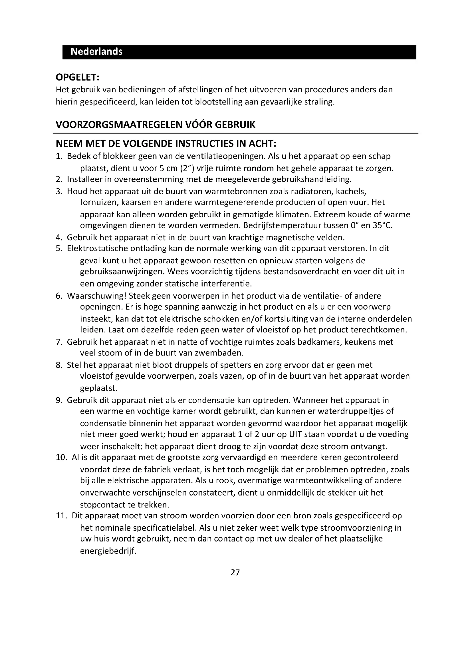 9. Gebruik dit apparaat niet als er condensatie kan optreden. Wanneer het apparaat in
