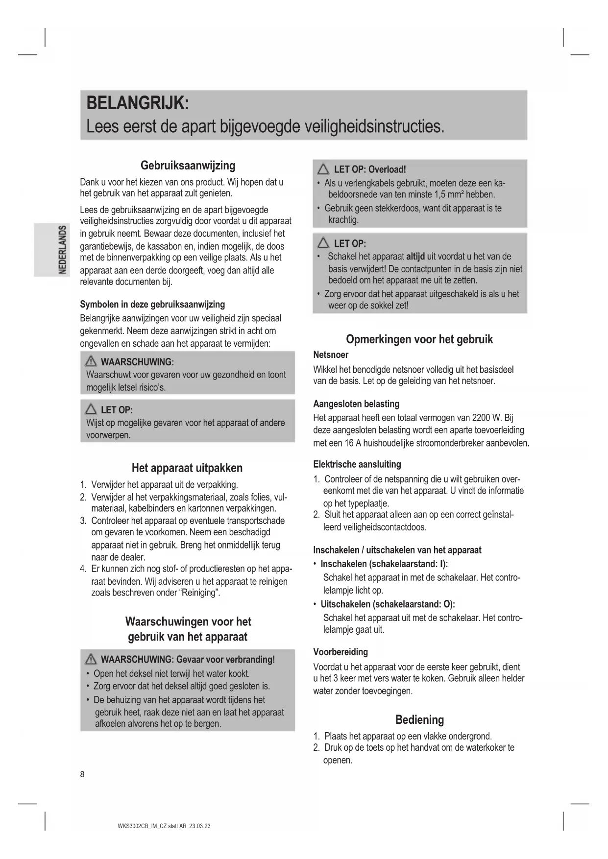 Oplossen van storingen Probleem Mogelijke oorzaak Oplossing Het apparaat schakelt niet in. Het apparaat heeft geen stroom- voorziening. Controleer het stopcontact met een ander apparaat. Steek de netstekker er goed in. Controleer de huiszekering. Het apparaat is defect. Neem contact op met onze servicedienst of een specialist. Na werking zonder water of met te weinig water is het apparaat nog niet voldoende afgekoeld. Laat het apparaat 15 minuten afkoelen. Het apparaat schakelt voor het koken uit. De binnenzijde van de waterkoker is sterk verkalkt of het stopcontact- circuit is overbelast. Ontkalk volgens de gebruiksaanwijzing. Controleer de netaansluiting. Het apparaat schakelt niet uit. Het deksel is niet gesloten. Sluit het deksel tot het vastklikt. Technische gegevens Model:.............................................................. WKS 3002 CB Stroomvoorziening: ..................................220 – 240 V~, 50 Hz Opgenomen vermogen: ................................... 1850 – 2200 W Beschermingsklasse: ............................................................. Vulcapaciteit: ...................................................... max. 1,5 liter Nettogewicht: ........................................................ ong. 0,8 kg Het recht om technische en ontwerpaanpassingen te ma- ken in de loop van voortdurende productontwikkeling blijft voorbehouden. Dit apparaat is getest volgens alle van toepassing zijnde, huidige CE-richtlijnen en gebouwd volgens de meest recente veiligheidsvoorschriften. Verwijdering Betekenis van het symbool “vuilnisemmer” Bescherm ons milieu, elektrische apparaten ho- ren niet in het huisafval. Maak voor het afvoeren van elektrische appara- ten gebruik van de voorgeschreven verzamel- punten en geef daar de elektrische apparaten af die u niet meer gebruikt. Daardoor helpt u de potentiële effecten te voorkomen die een verkeerde afvoer op het milieu en de menselijke gezondheid kunnen hebben. Op deze wijze levert u uw bijdrage aan het hergebruik, de recycling en andere verwerkingsvormen voor oude elektro- nische en elektrische apparaten. Voor informatie over verzamelpunten voor uw apparaten kunt u contact opnemen met uw gemeente of gemeen- teadministratie. Uw dealer en contractpartner is bovendien verplicht het oude apparaat gratis terug te nemen.WKS3002CB_IM_CZ statt AR 23.03.23