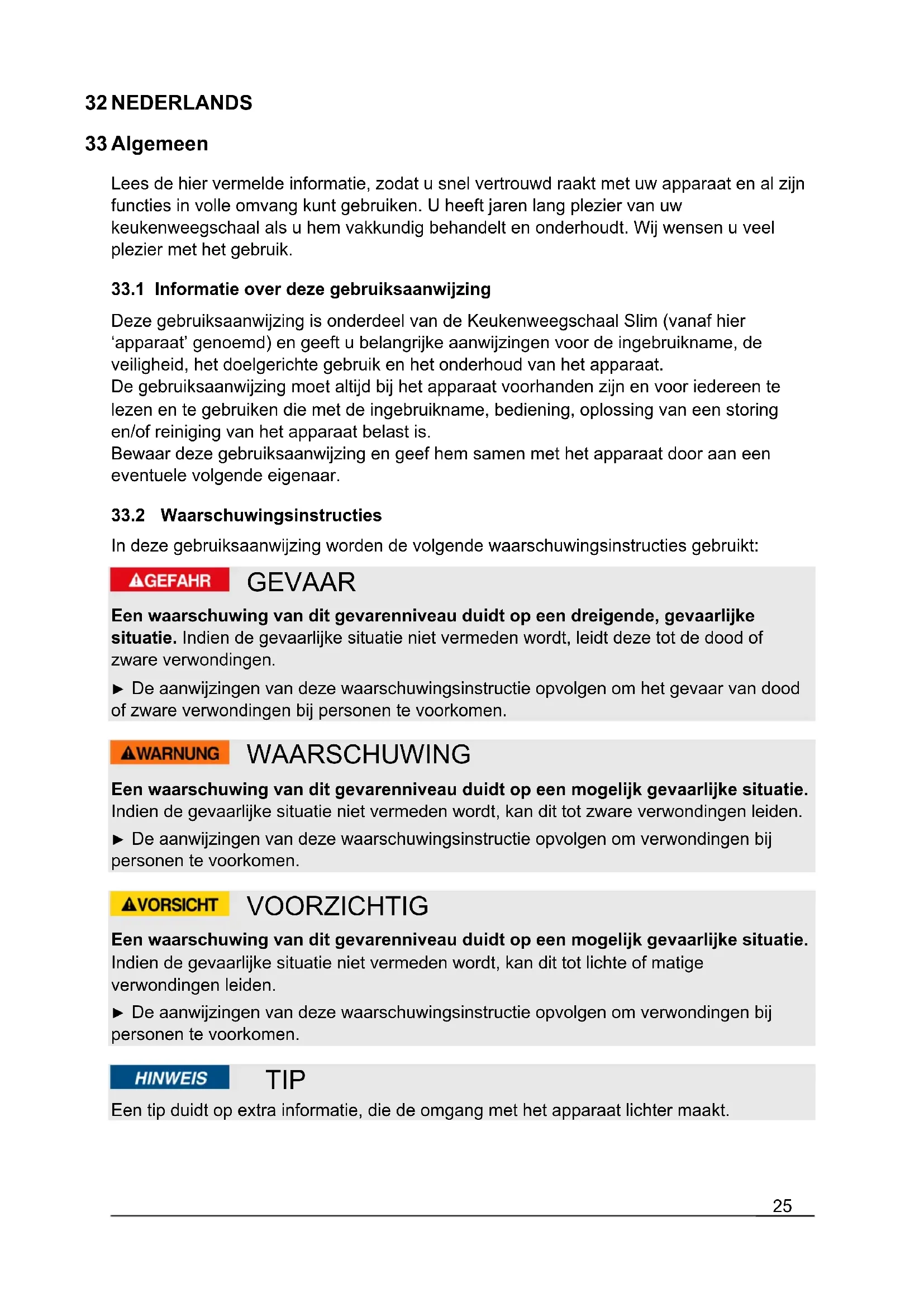 In deze gebruiksaanwijzing worden de volgende waarschuwingsinstructies gebruikt: GEVAAR Een waarschuwing van dit gevarenniveau duidt op een dreigende, gevaarlijke situatie. Indien de gevaarlijke situatie niet vermeden wordt, leidt deze tot de dood of zware verwondingen. ► De aanwijzingen van deze waarschuwingsinstructie opvolgen om het gevaar van dood of zware verwondingen bij personen te voorkomen. WAARSCHUWING Een waarschuwing van dit gevarenniveau duidt op een mogelijk gevaarlijke situatie. Indien de gevaarlijke situatie niet vermeden wordt, kan dit tot zware verwondingen leiden. ► De aanwijzingen van deze waarschuwingsinstructie opvolgen om verwondingen bij personen te voorkomen. VOORZICHTIG Een waarschuwing van dit gevarenniveau duidt op een mogelijk gevaarlijke situatie. Indien de gevaarlijke situatie niet vermeden wordt, kan dit tot lichte of matige verwondingen leiden. ► De aanwijzingen van deze waarschuwingsinstructie opvolgen om verwondingen bij personen te voorkomen. TIP Een tip duidt op extra informatie, die de omgang met het apparaat lichter maakt.26