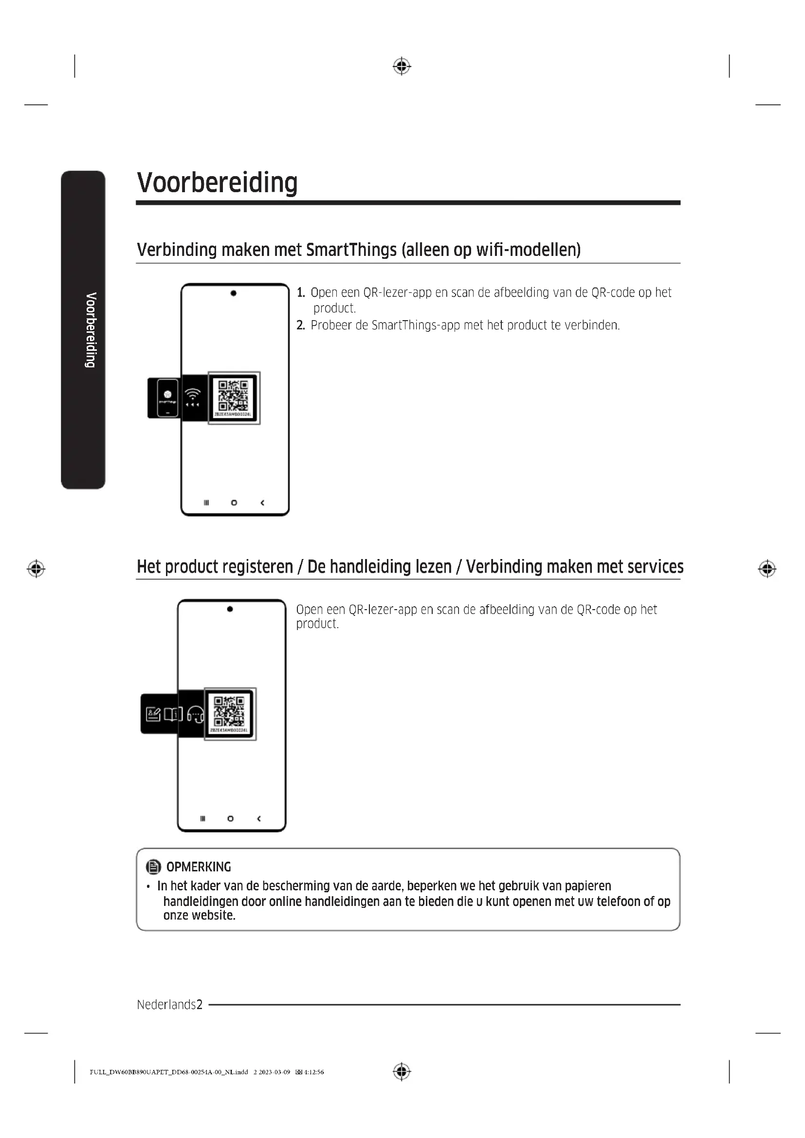 - In het kader van de bescherming van de aarde, beperken we het gebruik van papieren handleidingen door online handleidingen aan te bieden die u kunt openen met uw telefoon of op onze website. FULL_DW60BB890UAPET_DD68-00254A-00_NL.indd 2 2023-03-09 4:12:56Nederlands 3 Inhoud Inhoud Veiligheidsinformatie 5 Wat u moet weten over de veiligheidsvoorschriften 5 Belangrijke veiligheidssymbolen 5 WEEE-gerelateerde instructies 6 Belangrijke veiligheidsvoorschriften 7 Instructies voor het gebruik van de vaatwasser 9 Instructies voor het beschermen van uw kinderen 10 Instructies voor het installeren van de vaatwasser 10 Installatie 13 Wat is inbegrepen 13 Montagevereisten 17 Inbouwinstallatie onder de gootsteen (voor vrijstaand model) 19 Stappenplan installatie 20 Afmetingen gat 21 Plint 30 SmartThings (alleen bepaalde modellen) 32 Mededeling open source 35 Voor u begint 36 De vaatwasser in een oogopslag 36 Voorwerpen die ongeschikt zijn voor de vaatwasser 37 Standaard gebruik van de rekken 38 Vaatwasmiddeldispenser 42 Spoelmiddelreservoir 44 Zoutreservoir 45 Instellingen 46 Instellingen (met uitzondering van DW60BB89*-modellen) 49 Functies 52 Bedieningspaneel (voor DW60BB89*-modellen) 52 Bedieningspaneel (met uitzondering van DW60BB89*-modellen) 53 Programma-overzicht 54 Eenvoudig starten 56 Onderhoud 57 Schoonmaken 57 De afvoerpomp reinigen 61 Langdurig onderhoud 61 FULL_DW60BB890UAPET_DD68-00254A-00_NL.indd 3 2023-03-09 4:12:56Nederlands4 InhoudInhoud Problemen oplossen 62 Controlepunten 62 Informatiecodes 65 Vaatwasprogramma's 66 Bijlage 70 Transport/verplaatsen 70 Vorstbeveiliging 70 De vaatwasser op een milieuvriendelijke wijze afdanken 70 Tip voor water- en energiebesparing 71 EPREL-gegevens 71 Specicaties 72 Voor standaardtest 73 FULL_DW60BB890UAPET_DD68-00254A-00_NL.indd 4 2023-03-09 4:12:56Nederlands 5 Veiligheidsinformatie Veiligheidsinformatie Gefeliciteerd met uw nieuwe Samsung-vaatwasser. Deze handleiding bevat belangrijke informatie over de installatie, het gebruik en het onderhoud van uw vaatwasmachine. Lees deze gebruikershandleiding aandachtig door om optimaal gebruik te maken van de vele voordelen en functies die deze vaatwasser u biedt. Wat u moet weten over de veiligheidsvoorschriften Lees deze handleiding aandachtig door, zodat u weet hoe u dit nieuwe apparaat met zijn uitgebreide mogelijkheden en functies op veilige en efciënte wijze gebruikt en bewaar de handleiding ter referentie op een veilige plaats nabij het apparaat. Gebruik dit apparaat alleen voor de doeleinden waarvoor het is ontworpen, zoals beschreven in deze gebruikershandleiding. In de waarschuwingen en veiligheidsvoorschriften in deze handleiding worden niet alle mogelijke omstandigheden en situaties besproken. Het is uw eigen verantwoordelijkheid om uw gezond verstand te gebruiken en voorzichtig te zijn bij de installatie, de bediening en het onderhoud van uw vaatwasser. Omdat de volgende gebruiksaanwijzingen van toepassing zijn op meerdere modellen, kunnen de specicaties van uw vaatwasser enigszins afwijken van de specicaties die in deze handleiding worden omschreven en zijn mogelijk niet alle waarschuwingen van toepassing. Neem contact op met het dichtstbijzijnde servicecentrum als u vragen of opmerkingen hebt of ga naar www.samsung.com voor online ondersteuning en informatie. Belangrijke veiligheidssymbolen Waar staan de pictogrammen en tekens in deze gebruikershandleiding voor: WAARSCHUWING Gevaar of onveilige handelingen die kunnen leiden tot ernstig persoonlijk letsel, een dodelijke aoop of materiële schade. LET OP Gevaar of onveilige handelingen die kunnen leiden tot persoonlijk letsel of materiële schade. OPMERKING Geeft aan dat er risico bestaat op persoonlijk letsel of materiële schade. Deze waarschuwingssymbolen dienen om persoonlijk letsel van uzelf en van anderen te voorkomen. Volg ze nauwgezet op. Bewaar deze instructies op een veilige plek en zorg ervoor dat nieuwe gebruikers vertrouwd zijn met de inhoud. Geef de instructies door aan een eventuele toekomstige eigenaar. FULL_DW60BB890UAPET_DD68-00254A-00_NL.indd 5 2023-03-09 4:12:56Nederlands6 Veiligheidsinformatie Veiligheidsinformatie WEEE-gerelateerde instructies Correcte verwijdering van dit product (elektrische & elektronische afvalapparatuur) (Van toepassing in landen waar afval gescheiden wordt ingezameld) Dit merkteken op het product, de accessoires of het informatiemateriaal duidt erop dat het product en zijn elektronische accessoires (bv. lader, headset, USB-kabel) niet met ander huishoudelijk afval verwijderd mogen worden aan het einde van hun gebruiksduur. Om mogelijke schade aan het milieu of de menselijke gezondheid door ongecontroleerde afvalverwijdering te voorkomen, moet u deze artikelen van andere soorten afval scheiden en op een verantwoorde manier recyclen, zodat het duurzame hergebruik van materiaalbronnen wordt bevorderd. Huishoudelijke gebruikers moeten contact opnemen met de winkel waar ze dit product hebben gekocht of met de gemeente waar ze wonen om te vernemen waar en hoe ze deze artikelen milieuvriendelijk kunnen laten recyclen. Zakelijke gebruikers moeten contact opnemen met hun leverancier en de algemene voorwaarden van de koopovereenkomst nalezen. Dit product en zijn elektronische accessoires mogen niet met ander bedrijfsafval voor verwijdering worden gemengd. Ga voor meer informatie over de milieuverbintenissen en productspecieke wettelijke verplichtingen van Samsung (bijvoorbeeld REACH, WEEE, batterijen) naar onze duurzaamheidspagina op Samsung.com FULL_DW60BB890UAPET_DD68-00254A-00_NL.indd 6 2023-03-09 4:12:57Nederlands 7 Veiligheidsinformatie Belangrijke veiligheidsvoorschriften Om de kans op brand, elektrische schokken of persoonlijk letsel bij het gebruik van uw apparaat te verminderen, dient u de veiligheidsvoorschriften te volgen, waaronder de volgende: