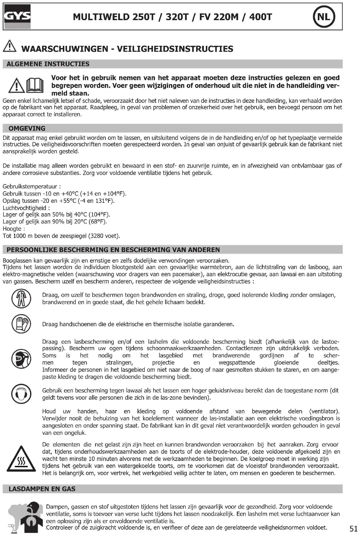 ALGEMENE INSTRUCTIES Voor het in gebruik nemen van het apparaat moeten deze instructies gelezen en goed begrepen worden. Voer geen wijzigingen of onderhoud uit die niet in de handleiding ver- meld staan. Geen enkel lichamelijk letsel of schade, veroorzaakt door het niet naleven van de instructies in deze handleiding, kan verhaald worden op de fabrikant van het apparaat. Raadpleeg, in geval van problemen of onzekerheid over het gebruik, een bevoegd persoon om het apparaat correct te installeren. OMGEVING Dit apparaat mag enkel gebruikt worden om te lassen, en uitsluitend volgens de in de handleiding en/of op het typeplaatje vermelde instructies. De veiligheidsvoorschriften moeten gerespecteerd worden. In geval van onjuist of gevaarlijk gebruik kan de fabrikant niet aansprakelijk worden gesteld. De installatie mag alleen worden gebruikt en bewaard in een stof- en zuurvrije ruimte, en in afwezigheid van ontvlambaar gas of andere corrosieve substanties. Zorg voor voldoende ventilatie tijdens het gebruik.Gebruikstemperatuur :Gebruik tussen -10 en +40°C (+14 en +104°F).Opslag tussen -20 en +55°C (-4 en 131°F).Luchtvochtigheid :Lager of gelijk aan 50% bij 40°C (104°F).Lager of gelijk aan 90% bij 20°C (68°F).Hoogte :Tot 1000 m boven de zeespiegel (3280 voet).