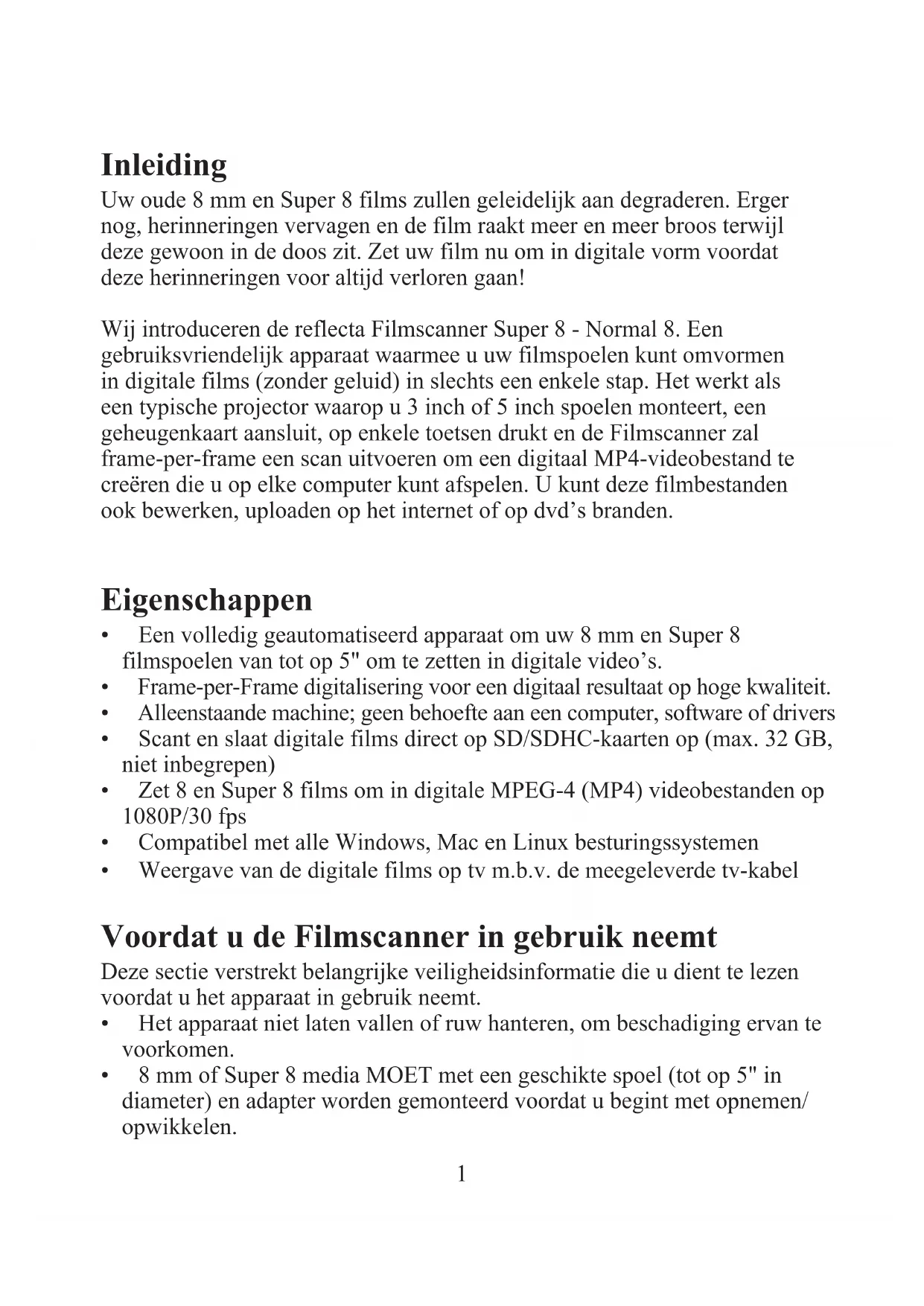 weergave zal nu op uw tv verschijnen. Specificaties Beeldsensor: 3,53 Megapixels (2304H x 1536V) 1/3" CMOS-sensor Display: Kleuren 2,4" TFT LCD Belichtingsregeling: Automatisch/handmatig (-2,0 tot 2,0) Witbalans: Automatisch Resolutie: 1440 x 1080p Framesnelheid van weergave: 30 frames per seconde* Scanmethode: Video Filmtype: 8 mm en Super 8 filmrol in 3" of 5" spoel Bestandsformaat: MP4 type TV-UIT: NTSC/PAL Ingebouwd geheugen: Geen Extern geheugen: SD/SDHC-geheugenkaart tot op 32 GB (max.)** Voeding: DC 12V Interface: USB 2.0 Taal: Engels, Frans, Spaans, Duits en Italiaans Afmetingen (L/B/H): 269 x 166 x 114 mm/10,6 x 6,5 x 4,5 inch Gewicht: 1410 g/3,1 lb Opmerking: *Gebruikers die de afspeelsnelheid willen veranderen in 18 of 24 fps, kunnen "VLC" downloaden, een gratis softwareprogramma van VLC.org, echter niet ondersteund door reflecta. **Elke 50 voet film neemt ongeveer 125 MB geheugen in beslag en ongeveer 30 minuten om op te nemen.reflecta GmbH Merkurstraße 8 Fon +497457/946560 E-Mail mail@reflecta.de 72184 Eutingen, Germany Fax +497457/946572 Web www.reflecta.de