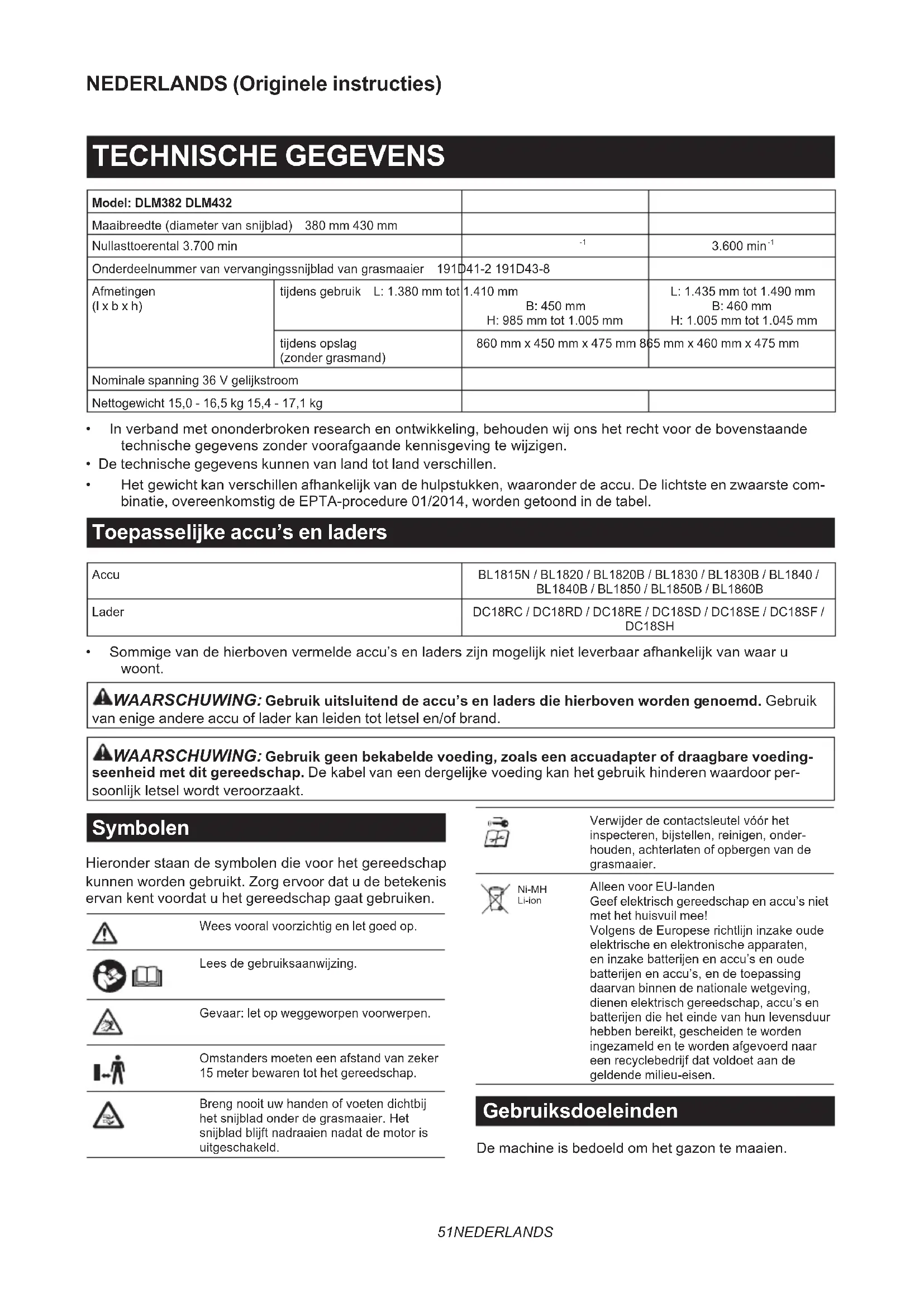 - Sommigevandehierbovenvermeldeaccu’senladerszijnmogelijknietleverbaarafhankelijkvanwaaru woont. WAARSCHUWING: Gebruik uitsluitend de accu’s en laders die hierboven worden genoemd. Gebruik van enige andere accu of lader kan leiden tot letsel en/of brand. WAARSCHUWING: Gebruik geen bekabelde voeding, zoals een accuadapter of draagbare voeding- seenheid met dit gereedschap.Dekabelvaneendergelijkevoedingkanhetgebruikhinderenwaardoorper- soonlijkletselwordtveroorzaakt. Symbolen Hieronderstaandesymbolendievoorhetgereedschap kunnen worden gebruikt. Zorg ervoor dat u de betekenis ervan kent voordat u het gereedschap gaat gebruiken. Wees vooral voorzichtig en let goed op. Leesdegebruiksaanwijzing. Gevaar: let op weggeworpen voorwerpen. Omstanders moeten een afstand van zeker 15 meter bewaren tot het gereedschap. Brengnooituwhandenofvoetendichtbij hetsnijbladonderdegrasmaaier.Het snijbladblijftnadraaiennadatdemotoris uitgeschakeld. Verwijderdecontactsleutelvóórhet inspecteren,bijstellen,reinigen,onder- houden, achterlaten of opbergen van de grasmaaier. Ni-MH Li-ion Alleen voor EU-landen Geef elektrisch gereedschap en accu’s niet met het huisvuil mee! VolgensdeEuropeserichtlijninzakeoude elektrische en elektronische apparaten, eninzakebatterijenenaccu’senoude batterijenenaccu’s,endetoepassing daarvan binnen de nationale wetgeving, dienen elektrisch gereedschap, accu’s en batterijendieheteindevanhunlevensduur hebben bereikt, gescheiden te worden ingezameld en te worden afgevoerd naar eenrecyclebedrijfdatvoldoetaande geldende milieu-eisen. Gebruiksdoeleinden De machine is bedoeld om het gazon te maaien.52 NEDERLANDS Geluidsniveau Detypische,A-gewogengeluidsniveauszijngemeten volgens EN60335-2-77: Model DLM382 Geluidsdrukniveau (L