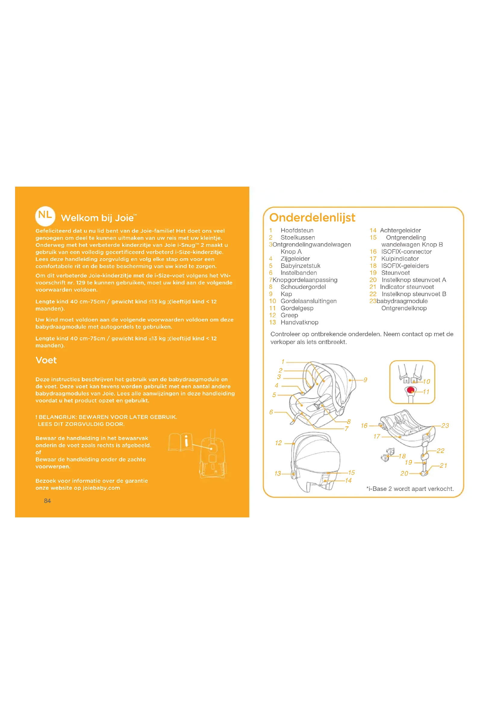 Gefeliciteerd dat u nu lid bent van de Joie-familie! Het doet ons veel genoegen om deel te kunnen uitmaken van uw reis met uw kleintje. Onderweg met het verbeterde kinderzitje van Joie i-Snug™ 2 maakt u gebruik van een volledig gecertificeerd verbeterd i-Size-kinderzitje. Lees deze handleiding zorgvuldig en volg elke stap om voor een comfortabele rit en de beste bescherming van uw kind te zorgen.Om dit verbeterde Joie-kinderzitje met de i-Size-voet volgens het VN-voorschrift nr. 129 te kunnen gebruiken, moet uw kind aan de volgende voorwaarden voldoen.Lengte kind 40 cm-75cm / gewicht kind ≤13 kg ;(leeftijd kind < 12 maanden).Uw kind moet voldoen aan de volgende voorwaarden voldoen om deze babydraagmodule met autogordels te gebruiken.Lengte kind 40 cm-75cm / gewicht kind ≤13 kg ;(leeftijd kind < 12 maanden). Voet Deze instructies beschrijven het gebruik van de babydraagmodule en de voet. Deze voet kan tevens worden gebruikt met een aantal andere babydraagmodules van Joie. Lees alle aanwijzingen in deze handleiding voordat u het product opzet en gebruikt.! BELANGRIJK: BEWAREN VOOR LATER GEBRUIK.LEES DIT ZORGVULDIG DOOR.Bewaar de handleiding in het bewaarvak onderin de voet zoals rechts is afgebeeld. Bewaar de handleiding onder de zachte voorwerpen.Bezoek voor informatie over de garantie onze website op joiebaby.com
