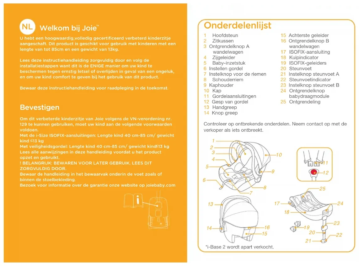 U hebt een hoogwaardig﹐volledig gecertificeerd verbeterd kinderzitje aangeschaft. Dit product is geschikt voor gebruik met kinderen met een lengte van tot 85cm en een gewicht van 13kg.Lees deze instructiehandleiding zorgvuldig door en volg de installatiestappen want dit is de ENIGE manier om uw kind te beschermen tegen ernstig letsel of overlijden in geval van een ongeluk﹐ en om uw kind comfort te geven bij het gebruik van dit product.Bewaar deze instructiehandleiding voor raadpleging in de toekomst. Bevestigen Om dit verbeterde kinderzitje van Joie volgens de VN-verordening nr. 129 te kunnen gebruiken﹐ moet uw kind aan de volgende voorwaarden voldoen.Met de i-Size ISOFIX-aansluitingen: Lengte kind 40 cm-85 cm/ gewicht kind 13 kgMet veiligheidsgordel: Lengte kind 40 cm-85 cm/ gewicht kind 13 kgLees alle aanwijzingen in deze handleiding voordat u het product opzet en gebruikt.! BELANGRIJK: BEWAREN VOOR LATER GEBRUIK. LEES DIT ZORGVULDIG DOOR.Bewaar de handleiding in het bewaarvak onderin de voet zoals of binnen de stoelbekleding.Bezoek voor informatie over de garantie onze website op joiebaby.com *i-Base 2 wordt apart verkocht.