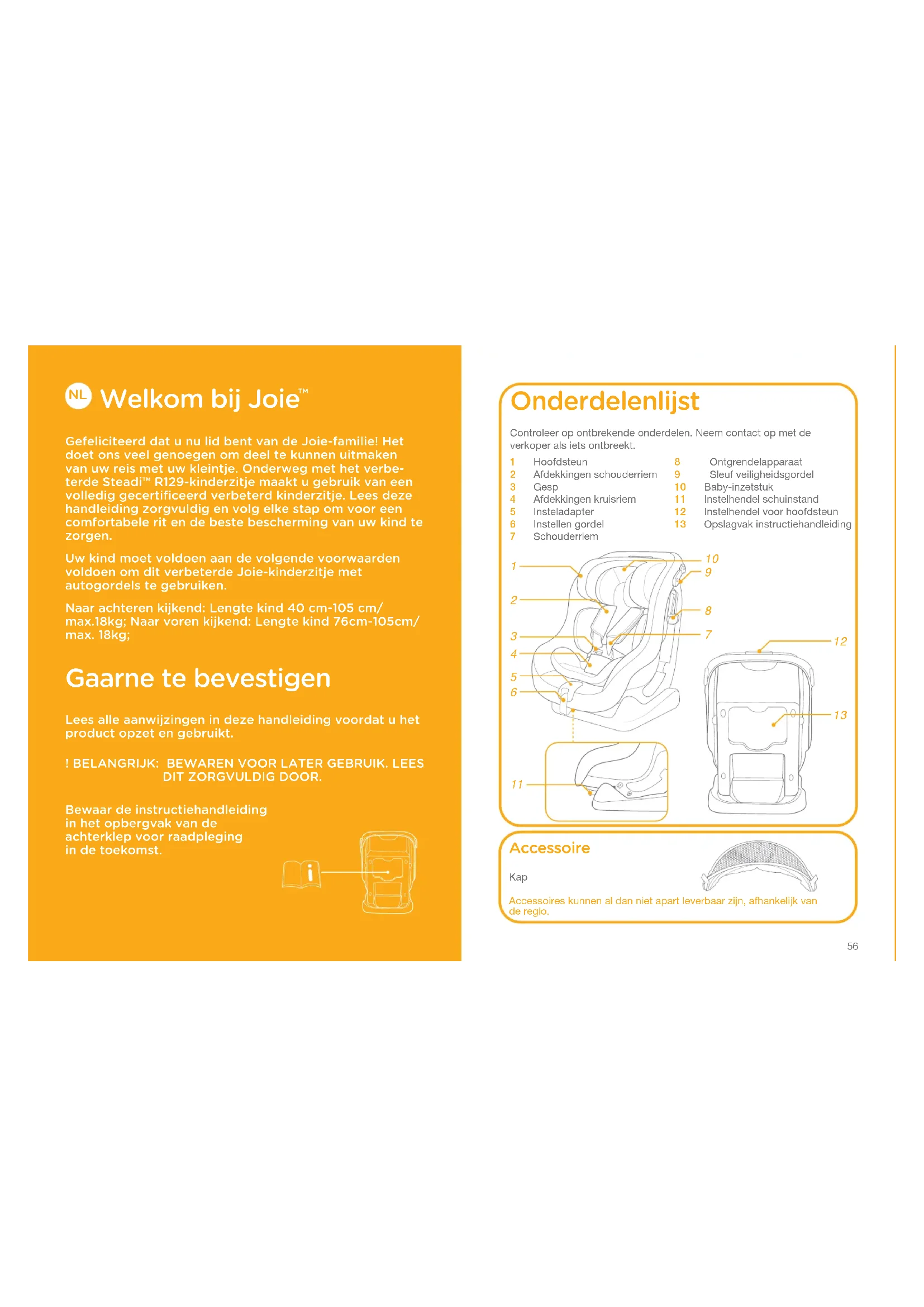 Gefeliciteerd dat u nu lid bent van de Joie-familie! Het doet ons veel genoegen om deel te kunnen uitmaken van uw reis met uw kleintje. Onderweg met het verbe-terde Steadi™ R129-kinderzitje maakt u gebruik van een volledig gecertificeerd verbeterd kinderzitje. Lees deze handleiding zorgvuldig en volg elke stap om voor een comfortabele rit en de beste bescherming van uw kind te zorgen.Uw kind moet voldoen aan de volgende voorwaarden voldoen om dit verbeterde Joie-kinderzitje met autogordels te gebruiken.Naar achteren kijkend: Lengte kind 40 cm-105 cm/ max.18kg; Naar voren kijkend: Lengte kind 76cm-105cm/max. 18kg; Gaarne te bevestigen Lees alle aanwijzingen in deze handleiding voordat u het product opzet en gebruikt.! BELANGRIJK: BEWAREN VOOR LATER GEBRUIK. LEES DIT ZORGVULDIG DOOR.Bewaar de instructiehandleiding in het opbergvak van de achterklep voor raadpleging in de toekomst.