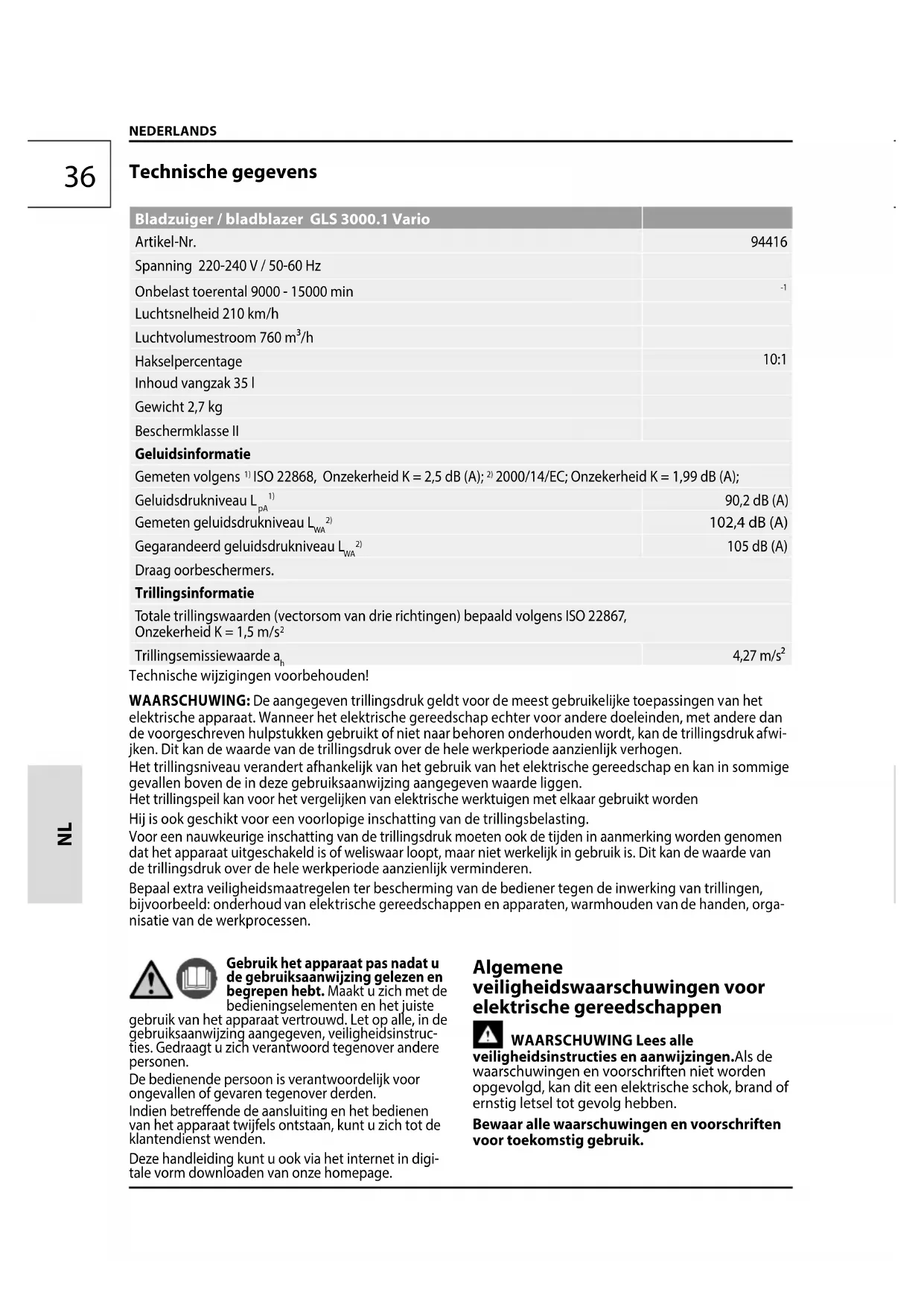 Luchtsnelheid 210 km/h Luchtvolumestroom 760 m³/h Hakselpercentage 10:1 Inhoud vangzak 35 l Gewicht 2,7 kg Beschermklasse II Geluidsinformatie Gemeten volgens