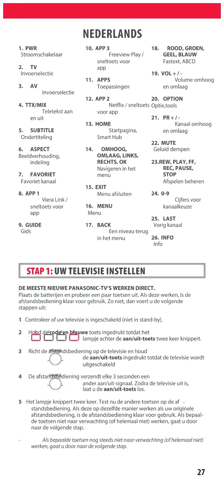 ripristinato. ITALIANO 712188_Panasonic_manual URC4914_RDN1091120.indd 26712188_Panasonic_manual URC4914_RDN1091120.indd 26 09-11-2020 13:1509-11-2020 13:1527 NEDERLANDS DE MEESTE NIEUWE PANASONIC-TV’S WERKEN DIRECT. Plaats de batterijen en probeer een paar toetsen uit. Als deze werken, is de afstandsbediening klaar voor gebruik. Zo niet, dan voert u de volgende stappen uit: 1 Controleer of uw televisie is ingeschakeld (niet in stand-by). 2 Houd de rode en blauwe toets ingedrukt totdat het lampje achter de aan/uit-toets twee keer knippert. 3 Richt de afstandsbediening op de televisie en houd de aan/uit-toets ingedrukt totdat de televisie wordt uitgeschakeld 4 De afstandsbediening verzendt elke 3 seconden een ander aan/uit-signaal. Zodra de televisie uit is, laat u de aan/uit-toets los. 5 Het lampje knippert twee keer. Test nu de andere toetsen op de af