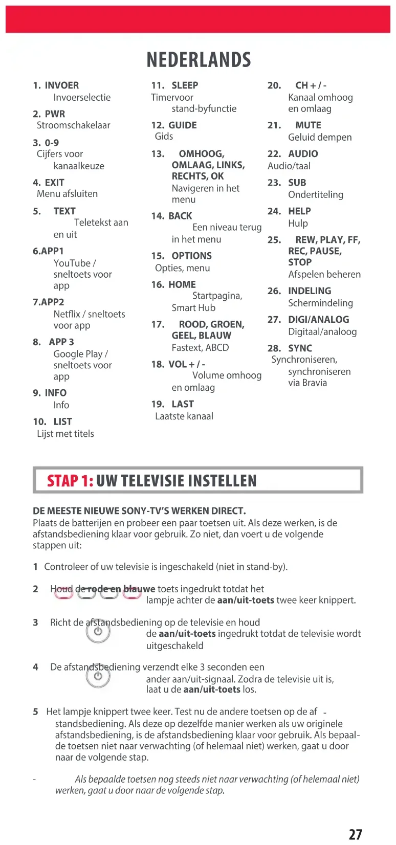 ripristinato. ITALIANO27 NEDERLANDS DE MEESTE NIEUWE SONY-TV’S WERKEN DIRECT. Plaats de batterijen en probeer een paar toetsen uit. Als deze werken, is de afstandsbediening klaar voor gebruik. Zo niet, dan voert u de volgende stappen uit: 1 Controleer of uw televisie is ingeschakeld (niet in stand-by). 2 Houd de rode en blauwe toets ingedrukt totdat het lampje achter de aan/uit-toets twee keer knippert. 3 Richt de afstandsbediening op de televisie en houd de aan/uit-toets ingedrukt totdat de televisie wordt uitgeschakeld 4 De afstandsbediening verzendt elke 3 seconden een ander aan/uit-signaal. Zodra de televisie uit is, laat u de aan/uit-toets los. 5 Het lampje knippert twee keer. Test nu de andere toetsen op de af