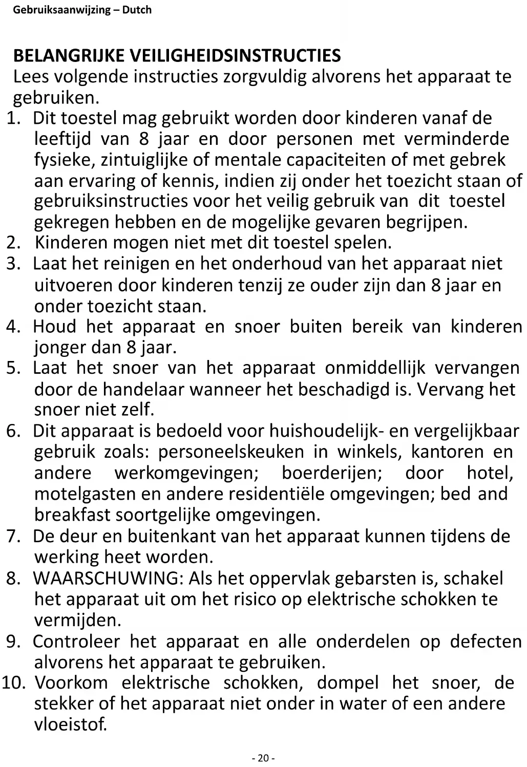 leeftijd van 8 jaar en door personen met verminderde fysieke, zintuiglijke of mentale capaciteiten of met gebrek aan ervaring of kennis, indien zij onder het toezicht staan of gebruiksinstructies voor het veilig gebruik van dit toestel gekregen hebben en de mogelijke gevaren begrijpen.