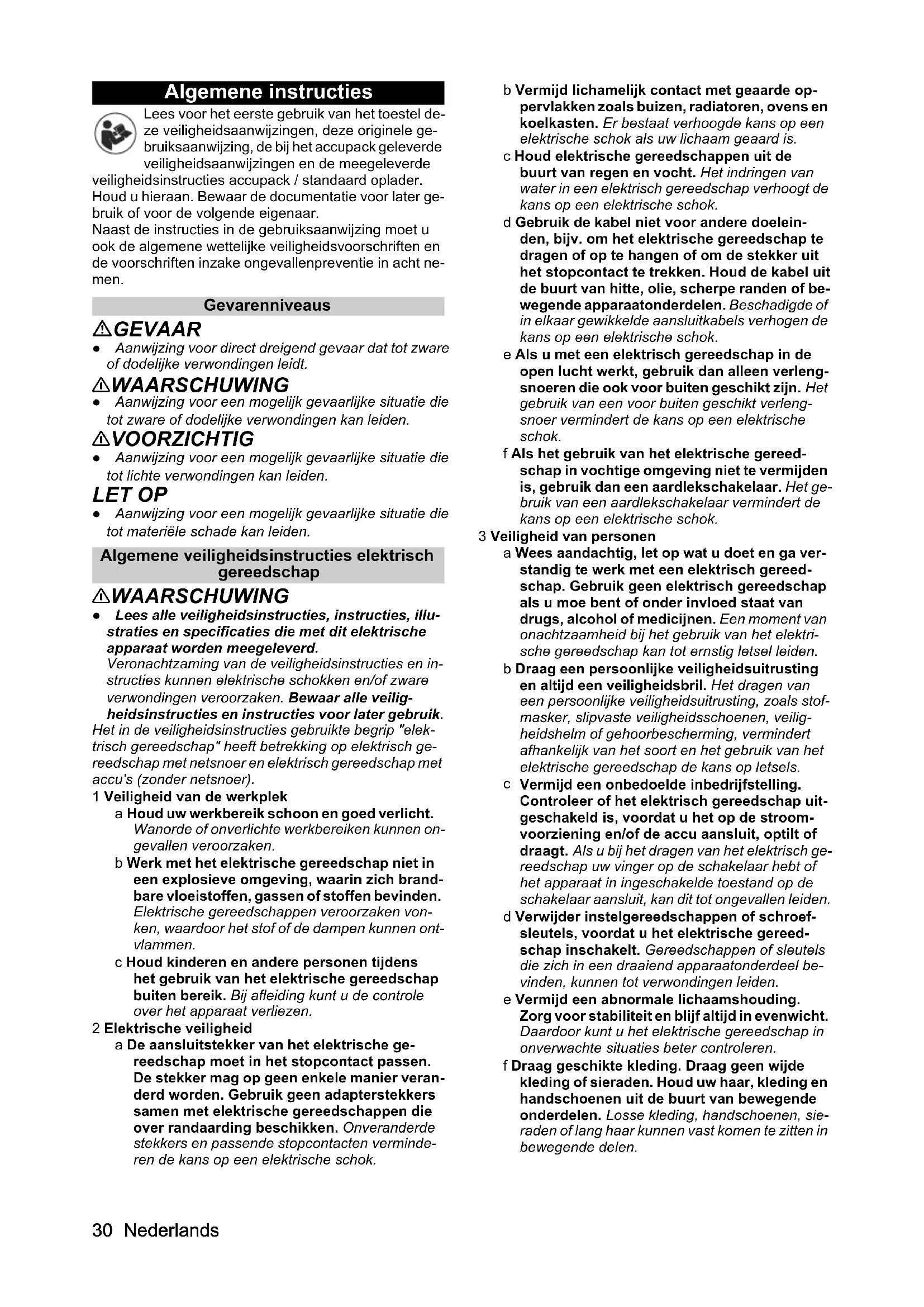- EU-conformiteitsverklaring Nederlands Algemene instructies Lees voor het eerste gebruik van het toestel de- ze veiligheidsaanwijzingen, deze originele ge- bruiksaanwijzing, de bij het accupack geleverde veiligheidsaanwijzingen en de meegeleverde veiligheidsinstructies accupack / standaard oplader. Houd u hieraan. Bewaar de documentatie voor later ge- bruik of voor de volgende eigenaar. Naast de instructies in de gebruiksaanwijzing moet u ook de algemene wettelijke veiligheidsvoorschriften en de voorschriften inzake ongevallenpreventie in acht ne- men. Gevarenniveaus GEVAAR ● Aanwijzing voor direct dreigend gevaar dat tot zware of dodelijke verwondingen leidt. 몇 WAARSCHUWING ● Aanwijzing voor een mogelijk gevaarlijke situatie die tot zware of dodelijke verwondingen kan leiden. 몇 VOORZICHTIG ● Aanwijzing voor een mogelijk gevaarlijke situatie die tot lichte verwondingen kan leiden. LET OP ● Aanwijzing voor een mogelijk gevaarlijke situatie die tot materiële schade kan leiden. Algemene veiligheidsinstructies elektrisch gereedschap 몇 WAARSCHUWING ● Lees alle veiligheidsinstructies, instructies, illu- straties en specificaties die met dit elektrische apparaat worden meegeleverd. Veronachtzaming van de veiligheidsinstructies en in- structies kunnen elektrische schokken en/of zware verwondingen veroorzaken. Bewaar alle veilig- heidsinstructies en instructies voor later gebruik. Het in de veiligheidsinstructies gebruikte begrip "elek- trisch gereedschap" heeft betrekking op elektrisch ge- reedschap met netsnoer en elektrisch gereedschap met accu's (zonder netsnoer). 1 Veiligheid van de werkplek a Houd uw werkbereik schoon en goed verlicht. Wanorde of onverlichte werkbereiken kunnen on- gevallen veroorzaken. b Werk met het elektrische gereedschap niet in een explosieve omgeving, waarin zich brand- bare vloeistoffen, gassen of stoffen bevinden. Elektrische gereedschappen veroorzaken von- ken, waardoor het stof of de dampen kunnen ont- vlammen. c Houd kinderen en andere personen tijdens het gebruik van het elektrische gereedschap buiten bereik. Bij afleiding kunt u de controle over het apparaat verliezen. 2 Elektrische veiligheid a De aansluitstekker van het elektrische ge- reedschap moet in het stopcontact passen. De stekker mag op geen enkele manier veran- derd worden. Gebruik geen adapterstekkers samen met elektrische gereedschappen die over randaarding beschikken. Onveranderde stekkers en passende stopcontacten verminde- ren de kans op een elektrische schok. b Vermijd lichamelijk contact met geaarde op- pervlakken zoals buizen, radiatoren, ovens en koelkasten. Er bestaat verhoogde kans op een elektrische schok als uw lichaam geaard is. c Houd elektrische gereedschappen uit de buurt van regen en vocht. Het indringen van water in een elektrisch gereedschap verhoogt de kans op een elektrische schok. d Gebruik de kabel niet voor andere doelein- den, bijv. om het elektrische gereedschap te dragen of op te hangen of om de stekker uit het stopcontact te trekken. Houd de kabel uit de buurt van hitte, olie, scherpe randen of be- wegende apparaatonderdelen. Beschadigde of in elkaar gewikkelde aansluitkabels verhogen de kans op een elektrische schok. e Als u met een elektrisch gereedschap in de open lucht werkt, gebruik dan alleen verleng- snoeren die ook voor buiten geschikt zijn. Het gebruik van een voor buiten geschikt verleng- snoer vermindert de kans op een elektrische schok. f Als het gebruik van het elektrische gereed- schap in vochtige omgeving niet te vermijden is, gebruik dan een aardlekschakelaar. Het ge- bruik van een aardlekschakelaar vermindert de kans op een elektrische schok. 3 Veiligheid van personen a Wees aandachtig, let op wat u doet en ga ver- standig te werk met een elektrisch gereed- schap. Gebruik geen elektrisch gereedschap als u moe bent of onder invloed staat van drugs, alcohol of medicijnen. Een moment van onachtzaamheid bij het gebruik van het elektri- sche gereedschap kan tot ernstig letsel leiden. b Draag een persoonlijke veiligheidsuitrusting en altijd een veiligheidsbril. Het dragen van een persoonlijke veiligheidsuitrusting, zoals stof- masker, slipvaste veiligheidsschoenen, veilig- heidshelm of gehoorbescherming, vermindert afhankelijk van het soort en het gebruik van het elektrische gereedschap de kans op letsels. p. 3530