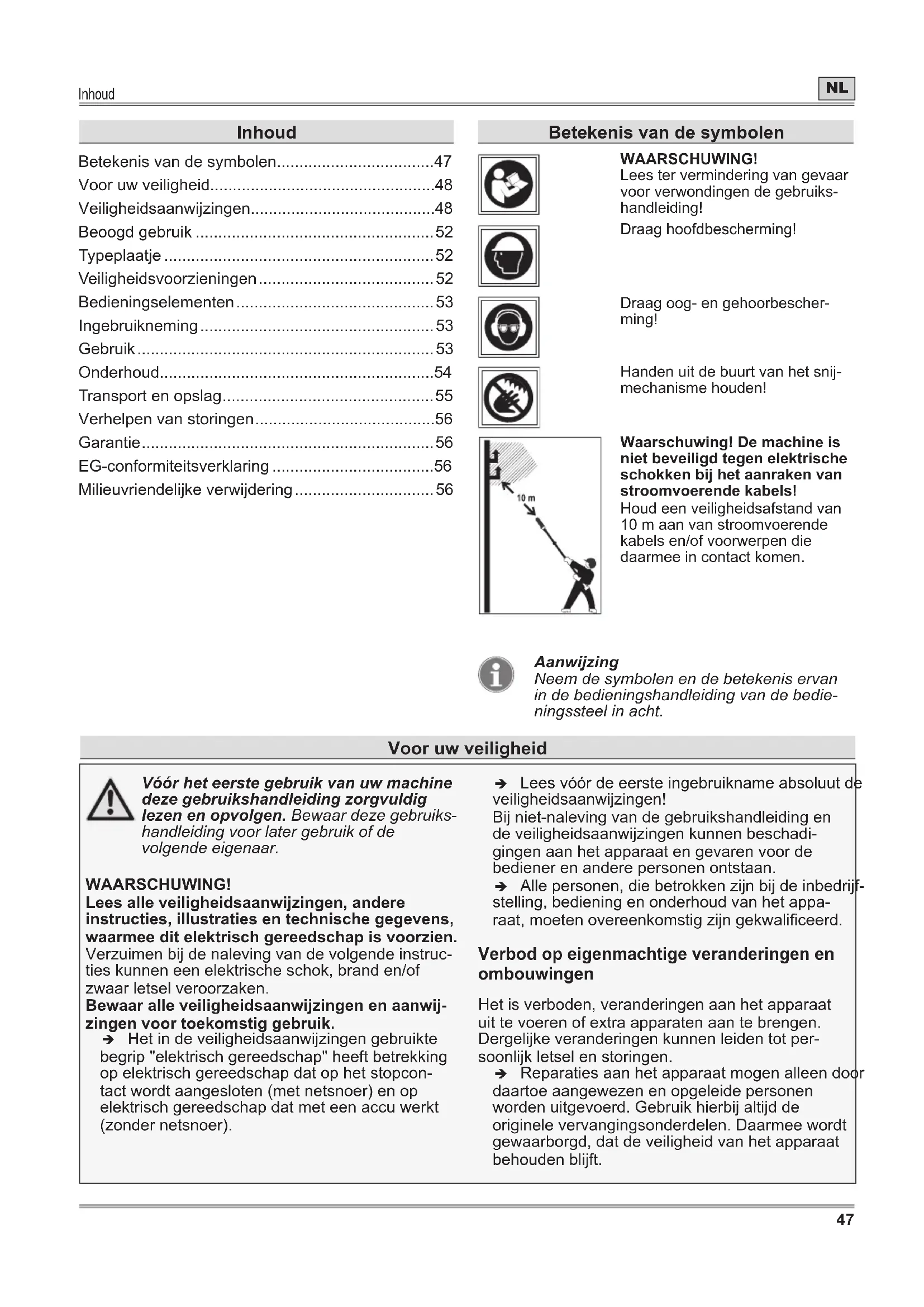 - Milieuvriendelijke verwijdering Betekenis van de symbolen WAARSCHUWING! Lees ter vermindering van gevaar voor verwondingen de gebruiks- handleiding! Draag hoofdbescherming! Draag oog- en gehoorbescher- ming! Handen uit de buurt van het snij- mechanisme houden! Waarschuwing! De machine is niet beveiligd tegen elektrische schokken bij het aanraken van stroomvoerende kabels! Houd een veiligheidsafstand van 10 m aan van stroomvoerende kabels en/of voorwerpen die daarmee in contact komen. Aanwijzing Neem de symbolen en de betekenis ervan in de bedieningshandleiding van de bedie- ningssteel in acht. Voor uw veiligheid Vóór het eerste gebruik van uw machine deze gebruikshandleiding zorgvuldig lezen en opvolgen. Bewaar deze gebruiks- handleiding voor later gebruik of de volgende eigenaar. WAARSCHUWING! Lees alle veiligheidsaanwijzingen, andere instructies, illustraties en technische gegevens, waarmee dit elektrisch gereedschap is voorzien. Verzuimen bij de naleving van de volgende instruc- ties kunnen een elektrische schok, brand en/of zwaar letsel veroorzaken. Bewaar alle veiligheidsaanwijzingen en aanwij- zingen voor toekomstig gebruik. Î Het in de veiligheidsaanwijzingen gebruikte begrip "elektrisch gereedschap" heeft betrekking op elektrisch gereedschap dat op het stopcon- tact wordt aangesloten (met netsnoer) en op elektrisch gereedschap dat met een accu werkt (zonder netsnoer). Î Lees vóór de eerste ingebruikname absoluut de veiligheidsaanwijzingen! Bij niet-naleving van de gebruikshandleiding en de veiligheidsaanwijzingen kunnen beschadi- gingen aan het apparaat en gevaren voor de bediener en andere personen ontstaan. Î Alle personen, die betrokken zijn bij de inbedrijf- stelling, bediening en onderhoud van het appa- raat, moeten overeenkomstig zijn gekwaliceerd. Verbod op eigenmachtige veranderingen en ombouwingen Het is verboden, veranderingen aan het apparaat uit te voeren of extra apparaten aan te brengen. Dergelijke veranderingen kunnen leiden tot per- soonlijk letsel en storingen. Î Reparaties aan het apparaat mogen alleen door daartoe aangewezen en opgeleide personen worden uitgevoerd. Gebruik hierbij altijd de originele vervangingsonderdelen. Daarmee wordt gewaarborgd, dat de veiligheid van het apparaat behouden blijft.Voor uw veiligheid p. 56