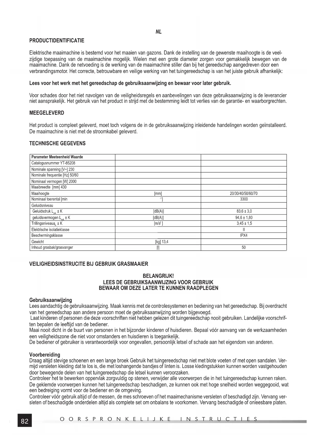 OORSPRONKELIJKE INSTRUCTIES PRODUCTIDENTIFICATIE Elektrische maaimachine is bestemd voor het maaien van gazons. Dank de instelling van de gewenste maaihoogte is de veel- zijdige toepassing van de maaimachine mogelijk. Wielen met een grote diameter zorgen voor gemakkelijk bewegen van de maaimachine. Dank de netvoeding is de werking van de maaimachine stiller dan bij het gereedschap aangedreven door een verbrandingsmotor. Het correcte, betrouwbare en veilige werking van het tuingereedschap is van het juiste gebruik afhankelijk: Lees voor het werk met het gereedschap de gebruiksaanwijzing en bewaar voor later gebruik. Voor schades door het niet navolgen van de veiligheidsregels en aanbevelingen van deze gebruiksaanwijzing is de leverancier niet aansprakelijk. Het gebruik van het product in strijd met de bestemming leidt tot verlies van de garantie- en waarborgrechten. MEEGELEVERD Het product is compleet geleverd, moet toch volgens de in de gebruiksaanwijzing inleidende handelingen worden geïnstalleerd. De maaimachine is niet met de stroomkabel geleverd. TECHNISCHE GEGEVENS Parameter Meeteenheid Waarde Catalogusnummer YT-85208 Nominale spanning [V~] 230 Nominale frequentie [Hz] 50/60 Nominaal vermogen [W] 2000 Maaibreedte [mm] 430 Maaihoogte [mm] 20/30/40/50/60/70 Nominaal toerental [min