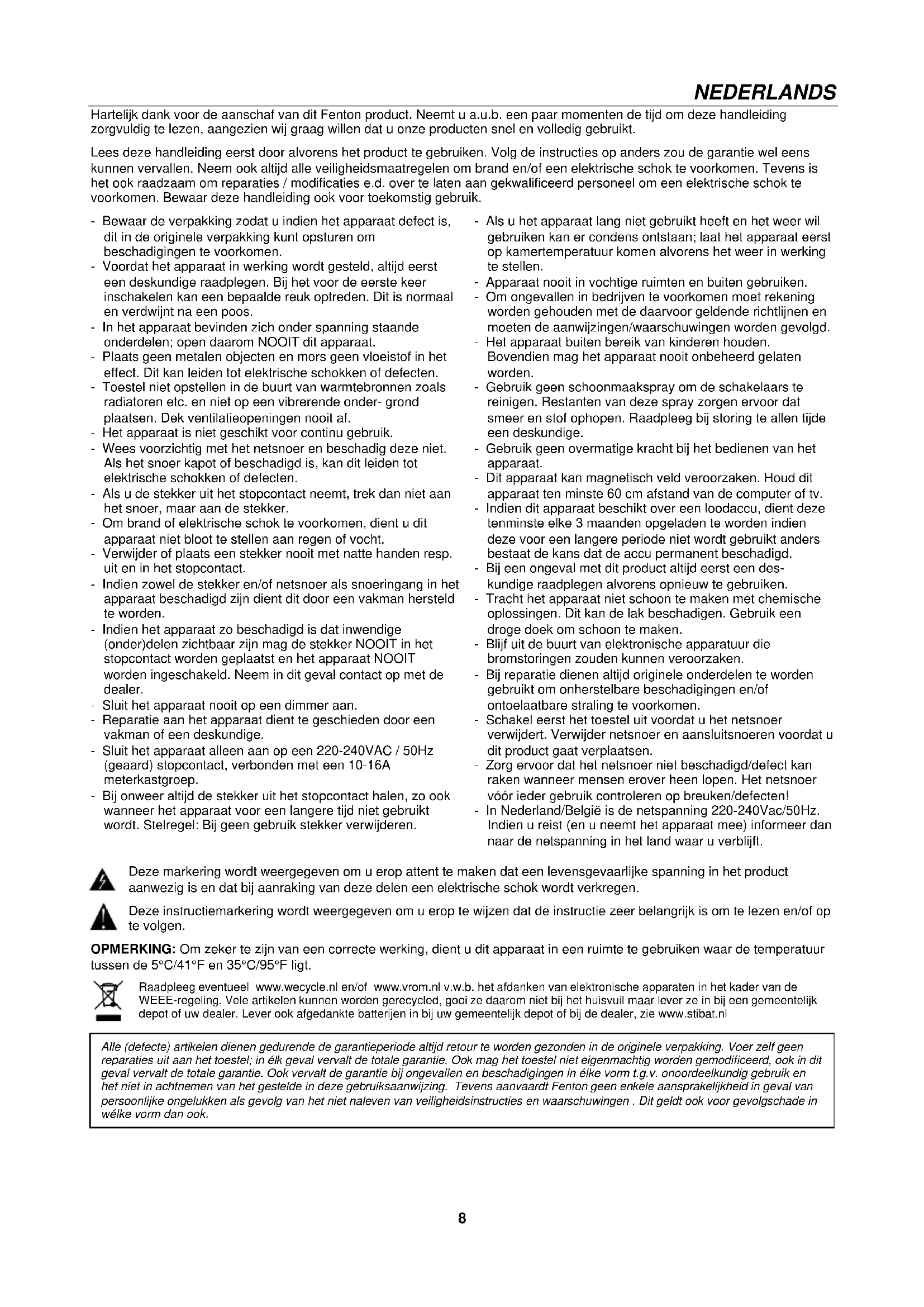 Alle (defecte) artikelen dienen gedurende de garantieperiode altijd retour te worden gezonden in de originele verpakking. Voer zelf geen reparaties uit aan het toestel; in élk geval vervalt de totale garantie. Ook mag het toestel niet eigenmachtig worden gemodificeerd, ook in dit geval vervalt de totale garantie. Ook vervalt de garantie bij ongevallen en beschadigingen in élke vorm t.g.v. onoordeelkundig gebruik en het niet in achtnemen van het gestelde in deze gebruiksaanwijzing. Tevens aanvaardt Fenton geen enkele aansprakelijkheid in geval van persoonlijke ongelukken als gevolg van het niet naleven van veiligheidsinstructies en waarschuwingen . Dit geldt ook voor gevolgschade in wélke vorm dan ook.9 UITPAKKEN LET OP! Pak na ontvangst de doos zorgvuldig uit. Controleer of alle onderdelen aanwezig- en in goede staat ontvangen zijn. Bij transportschade of bij het ontbreken van onderdelen onmiddellijk de verkopende partij inlichten. Bewaar de verpakking en het verpakkingsmateriaal. Indien het product moet worden teruggestuurd, is het belangrijk dat het product in originele verpakking wordt geretourneerd. Schakel het apparaat niet onmiddellijk in als het apparaat is blootgesteld aan drastische temperatuurverschillen (bv. na het transport). De ontstane condensatie kan het apparaat beschadigen. Zorg ervoor dat het apparaat eerst op kamertemperatuur komt alvorens het aan te sluiten. OVERZICHT