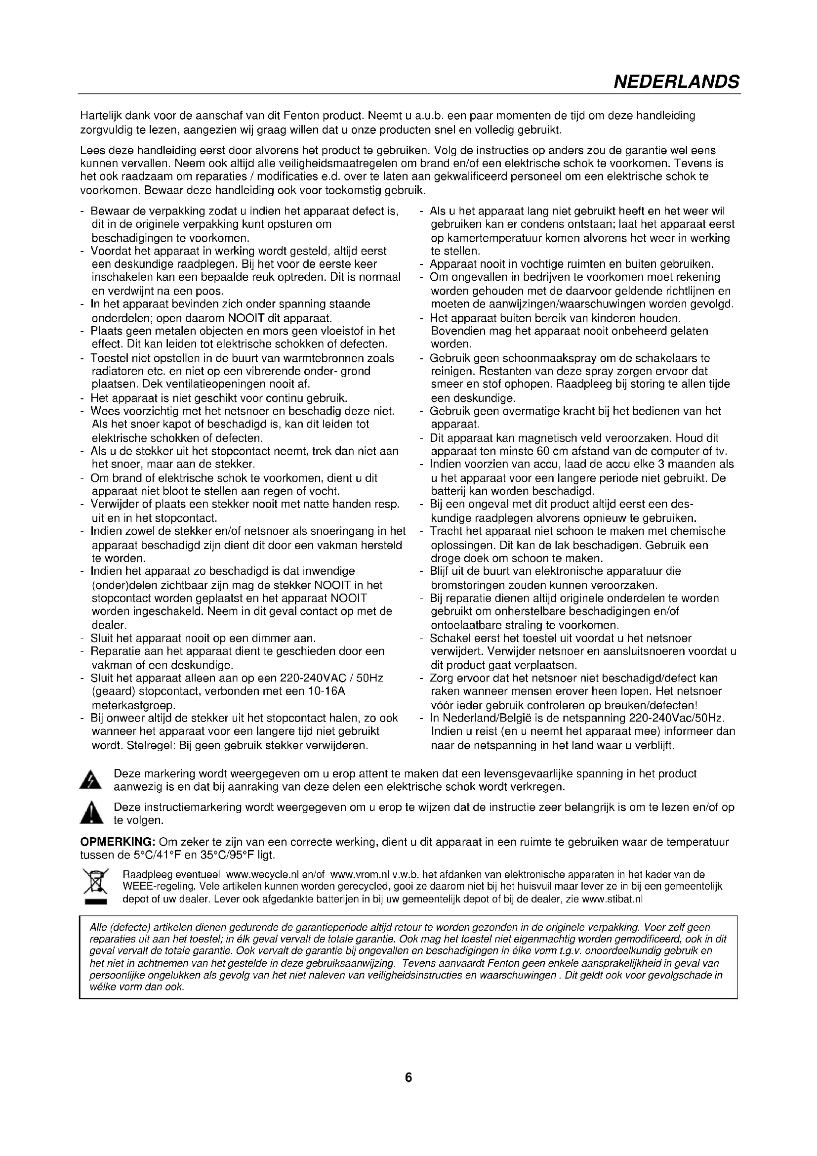 Alle (defecte) artikelen dienen gedurende de garantieperiode altijd retour te worden gezonden in de originele verpakking. Voer zelf geen reparaties uit aan het toestel; in élk geval vervalt de totale garantie. Ook mag het toestel niet eigenmachtig worden gemodificeerd, ook in dit geval vervalt de totale garantie. Ook vervalt de garantie bij ongevallen en beschadigingen in élke vorm t.g.v. onoordeelkundig gebruik en het niet in achtnemen van het gestelde in deze gebruiksaanwijzing. Tevens aanvaardt Fenton geen enkele aansprakelijkheid in geval van persoonlijke ongelukken als gevolg van het niet naleven van veiligheidsinstructies en waarschuwingen . Dit geldt ook voor gevolgschade in wélke vorm dan ook.7 OVERZICHT