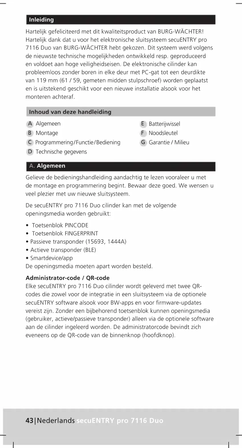 Technische gegevens A. Algemeen Gelieve de bedieningshandleiding aandachtig te lezen vooraleer u met de montage en programmering begint. Bewaar deze goed. We wensen u veel plezier met uw nieuwe sluitsysteem. De secuENTRY pro 7116 Duo cilinder kan met de volgende openingsmedia worden gebruikt: