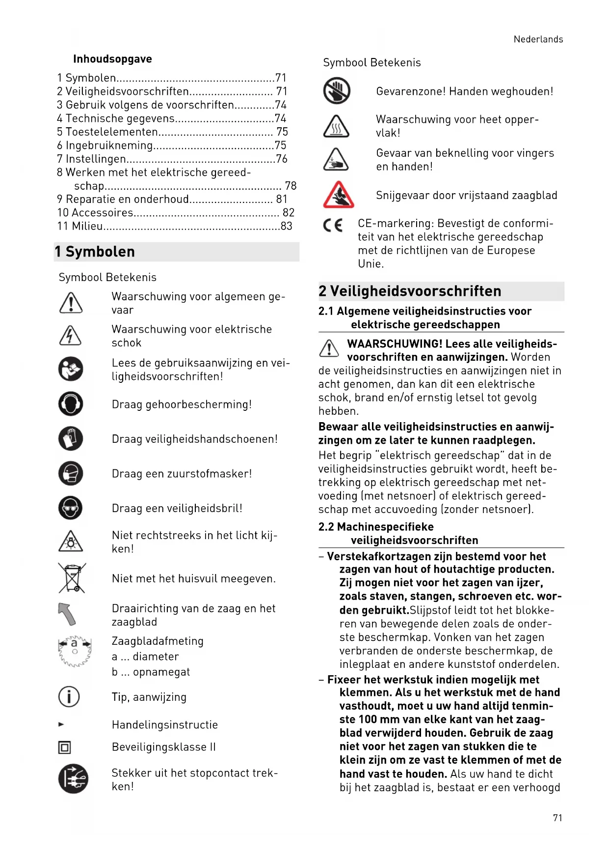 veiligheidsvoorschriften – Verstekafkortzagen zijn bestemd voor het zagen van hout of houtachtige producten. Zij mogen niet voor het zagen van ijzer, zoals staven, stangen, schroeven etc. wor den gebruikt.Slijpstof leidt tot het blokke ren van bewegende delen zoals de onder ste beschermkap. Vonken van het zagen verbranden de onderste beschermkap, de inlegplaat en andere kunststof onderdelen. – Fixeer het werkstuk indien mogelijk met klemmen. Als u het werkstuk met de hand vasthoudt, moet u uw hand altijd tenmin ste 100 mm van elke kant van het zaag blad verwijderd houden. Gebruik de zaag niet voor het zagen van stukken die te klein zijn om ze vast te klemmen of met de hand vast te houden. Als uw hand te dicht bij het zaagblad is, bestaat er een verhoogd Nederlands 71letselgevaar door contact met het zaag blad. – Het werkstuk moet onbeweeglijk zijn en óf vastgespannen óf tegen de aanslag en de tafel gedrukt worden. Schuif het werkstuk niet in het zaagblad en zaag nooit 'uit de vrije hand'.Losse of bewegende werkstuk ken zouden met hoge snelheid weggeslin gerd kunnen worden en tot letsel leiden. – Schuif de zaag door het werkstuk. Voor kom dat u de zaag door het werkstuk trekt. Voor een zaagsnede tilt u de zaag kop op en trekt u hem over het werkstuk zonder te zagen. Vervolgens schakelt u de motor in, zwenkt u de zaagkop naar bene den en drukt u de zaag door het werkstuk. Bij een trekkende zaagsnede bestaat het gevaar dat het zaagblad uit het werkstuk omhoog komt en de zaagbladeenheid met geweld naar de bediener wordt geslingerd. – Ga nooit, noch voor noch achter het zaag blad, kruiselings met uw hand over de be oogde zaaglijn heen. Het vasthouden van het werkstuk "met gekruiste handen", d.w.z. het vasthouden van het werkstuk met de linkerhand rechts van het zaagblad of omgekeerd is zeer gevaarlijk. – Kom nooit bij een draaiend zaagblad met uw hand achter de aanslag. Zorg ervoor dat de veiligheidsmarge tussen uw hand en het draaiende zaagblad nooit minder is dan 100 mm. (Dit geldt voor beide kanten van het zaagblad, bijv. bij het verwijderen van houtafval). Een geringe afstand van het draaiende zaagblad tot uw hand is mogelij kerwijs niet duidelijk zichtbaar en u kunt ernstig letsel oplopen. – Controleer het werkstuk voor het zagen. Als het werkstuk gebogen of vervormd is, spant u het met de naar buiten gekromde kant in de richting van de aanslag vast. Zorg er altijd voor dat er langs de zaaglijn geen spleet is tussen werkstuk, aanslag en tafel. Gebogen of vervormde werkstuk ken kunnen verdraaid raken of verplaatsen, waardoor het draaiende zaagblad bij het zagen beklemd kan raken. Er mogen zich geen spijkers of oneigenlijke elementen in het werkstuk bevinden. – Gebruik de zaag pas wanneer de tafel vrij is van gereedschap, houtafval, etc.; alleen het werkstuk mag zich op de tafel bevin den. Klein afval, losse houtstukken of an dere voorwerpen die in contact komen met het draaiende blad, kunnen met hoge snel heid worden weggeslingerd. – Zaag nooit meer dan één werkstuk tege lijk. Meerdere gestapelde werkstukken kunnen niet goed worden gespannen of vastgehouden en kunnen tijdens het zagen wegschuiven of ervoor zorgen, dat het blad vastloopt. – Zorg ervoor dat de verstekafkortzaag vóór gebruik op een vlak, stevig werkvlak staat. Een vlak en stevig werkvlak vermin dert het gevaar dat de verstekafkortzaag instabiel wordt. – Plan uw werk. Telkens wanneer u de ver stekhoek van het zaagblad verandert, moet u erop letten dat de instelbare aan slag juist is afgesteld, het werkstuk on dersteunt en daarbij niet met het blad of de beschermkap in contact komt. Simuleer bij een niet-ingeschakelde machine en zon der werkstuk op de tafel een volledige zaagbeweging van zaagblad om er zeker van te zijn dat er geen sprake is van belem meringen of het gevaar dat in de aanslag wordt gezaagd. – Zorg bij werkstukken die breder of langer zijn dan het tafeloppervlak voor een pas sende ondersteuning, bijv. door tafelver lengingen of zaagbokken. Werkstukken die langer of breder zijn dan de tafel van de verstekafkortzaag, kunnen kantelen indien ze niet goed worden ondersteund. Wanneer een afgezaagd stuk hout of werkstuk kan telt, kan het de onderste beschermkap omhoog laten komen of ongecontroleerd door het draaiende zaagblad worden weg geslingerd. – Roep niet de hulp van andere personen in als vervanging voor een tafelverlenging of als extra steun. Een instabiele ondersteu ning van het werkstuk kan ertoe leiden, dat het blad vastloopt. Ook kan het werkstuk tijdens het zagen verschuiven en u en uw hulp in het draaiende blad trekken. – Het afgezaagde stuk mag niet tegen het draaiende zaagblad worden gedrukt. Wan neer er weinig plaats is, bijv. bij gebruik van lengteaanslagen, kan het afgezaagde stuk bij het blad ingeklemd raken en met ge weld worden weggeslingerd. – Gebruik altijd een klem of een passende voorziening om rond materiaal, zoals stangen of buizen, goed te ondersteunen. Stangen kunnen bij het zagen gemakkelijk Nederlands 72wegrollen, waardoor het zaagblad zich kan "vastbijten" en het werkstuk met uw hand in het blad getrokken kan worden. – Laat het blad het volledige toerental be reiken voordat u in het werkstuk zaagt. Dit vermindert het risico dat het werkstuk weggeslingerd wordt. – Schakel de verstekafkortzaag uit indien het werkstuk beklemd raakt of het zaag blad blokkeert. Wacht tot alle bewegende delen tot stilstand zijn gekomen, trek de stekker uit het stopcontact en/of haal de accu uit de machine. Verwijder vervolgens het ingeklemde materiaal. Wanneer u bij zo'n blokkering verder zaagt, kan dit leiden tot verlies van controle of beschadiging van de verstekafkortzaag. – Laat na het beëindigen van de zaagsnede de schakelaar los, houd de zaagkop om laag en wacht tot het blad stilstaat, voor dat u het afgezaagde stuk verwijdert. Het is zeer gevaarlijk om met de hand in de buurt van het uitlopende zaagblad te ko men. – Houd de handgreep goed vast als u een onvol