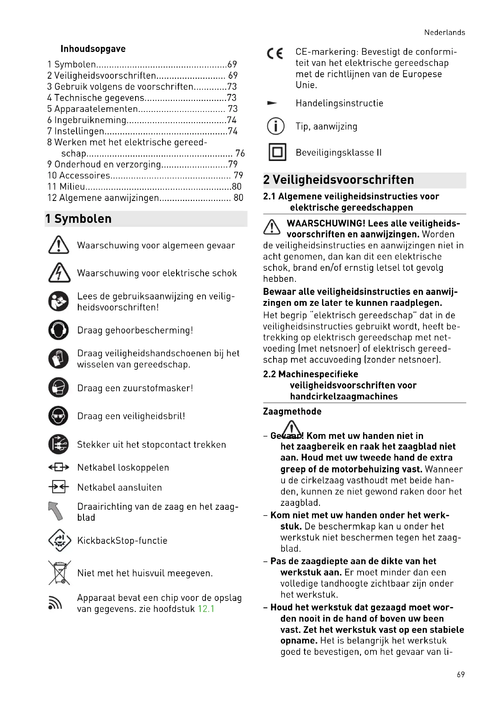 - 12 Algemene aanwijzingen 1 Symbolen Waarschuwing voor algemeen gevaar Waarschuwing voor elektrische schok Lees de gebruiksaanwijzing en veilig heidsvoorschriften! Draag gehoorbescherming! Draag veiligheidshandschoenen bij het wisselen van gereedschap. Draag een zuurstofmasker! Draag een veiligheidsbril! Stekker uit het stopcontact trekken Netkabel loskoppelen Netkabel aansluiten Draairichting van de zaag en het zaag blad KickbackStop-functie Niet met het huisvuil meegeven. Apparaat bevat een chip voor de opslag van gegevens. zie hoofdstuk 12.1 CE-markering: Bevestigt de conformi teit van het elektrische gereedschap met de richtlijnen van de Europese Unie. Handelingsinstructie Tip, aanwijzing Beveiligingsklasse II 2 Veiligheidsvoorschriften p. 80