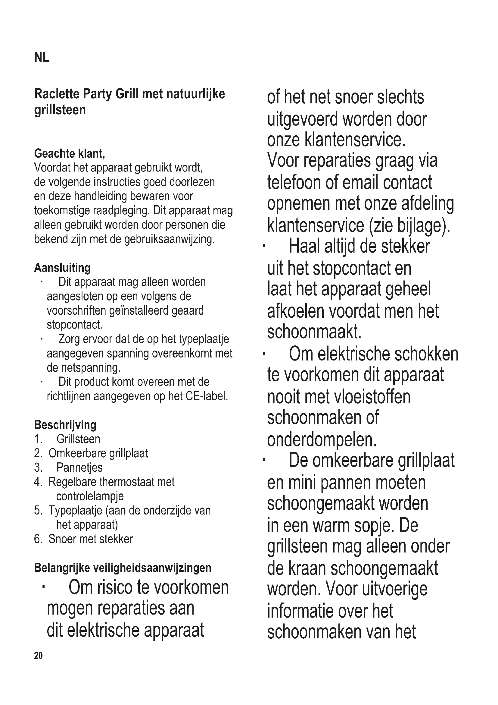 gebruik, het apparaat met steen / plaat en de pannetjes ca. 10 minuten op max. stand zonder vlees te verwarmen zodat de reuk, van het apparaat zelf, kan verdwijnen (hierbij kan een lichte rookontwikkeling ontstaan, zorg voor goede ventilatie). Men moet daarom zorgen voor voldoende ventilatie door ramen en balkon deuren te openen. ∙ Maak het toestel daarna schoon zoals beschreven in het hoofdstuk Onderhoud en schoonmaken. Steen ∙ Voordat het apparaat wordt gebruikt, plaats de steen, met de gepolijste kant naar boven gericht, naast de omkeerbare grillplaat op het apparaat, en zorg ervoor dat de ronde hoeken naar buiten gericht staan. Let op: Een koude steen mag niet op een heet element worden aangebracht. ∙ De steen kan, naar wens, worden gebruikt voor het koken van groenten, van in schijven gesneden vlees of vis, etc. ∙ Deze steen is gemaakt van natuurlijk materiaal. Kleine barsten erin zijn het resultaat van het natuurlijk uitzetten en krimpen ervan tijdens het verwarmen en afkoelen, terwijl ook een verandering in een donkerder kleur normaal is; een en ander heeft echter geen nadelige effecten. ∙ Plaats geen diepgevroren voedsel of voorwerpen die azijn bevatten (zoals zure augurken of mosterd) op de steen. Omkeerbare grillplaat ∙ Voordat het apparaat wordt gebruikt, plaats de omkeerbare grillplaat naast de steen op het apparaat, en zorg ervoor dat de ronde hoeken naar buiten gericht staan. ∙ Met de geribbelde kant naar boven gericht, kan de omkeerbare grillplaat worden gebruikt voor het grillen van vlees, worstjes, etc. De gladde kant is geschikt voor vis en groente. De grillplaat moet vóór het gebruik lichtjes ingevet worden. Regelbare thermostaat en controlelampje ∙ Met de thermostaat kan de temperatuur worden ingesteld tussen MIN en MAX. ∙ Het controlelampje geeft de status van het verwarmingselement aan: Verwarming aan = controlelampje aan Verwarming uit = controlelampje uit ∙ Na het beëindigen van maaltijdbereiding, thermostaat in laagste stand draaien, en stekker uit het stopcontact trekken. Gebruik Tip: Voor optimaal grillgenot moet het vlees 30 minuten vóór het grillen uit de koeler gehaald worden en op een afgedekt bord blijven liggen. ∙ Plaats de grillsteen en de omkeerbare grillplaat op het apparaat. ∙ Stop de stekker in het stopcontact en draai de thermostaat geheel naar rechts. ∙ Laat het apparaat voor 10 minuten voorverwarmen totdat de gewenste24 104 x 142 mm temperatuur bereikt is. Voor het gebruik van de grillsteen heeft men een voorverwarm tijd van ongeveer 25 minuten nodig. ∙ Plaats het te grillen voedsel op de omkeerbare grillplaat of op de steen zoals gewenst. ∙ Plaats de raclette kaas in de mini pannetjes. Plaats de mini pannetjes in het apparaat, onder het verwarmingselement, en laat ze daar staan totdat de kaas gesmolten is. ∙ Waarschuwing: Plaats nooit lege mini pannetjes in het apparaat wanneer het is aangezet. ∙ Na gebruik, draai de thermostaat geheel naar links en verwijder de stekker van het stroomnet. Voorbereiden van raclettekaas Snij per persoon ca. 200-300 gram zachte kaas in plakken van 3-5 mm. Doe deze plakken in de pannetjes. Het is te prefereren de originele raclette kaas te gebruiken. Elke andere snel smeltende kaas is echter ook geschikt. Praktische tips ∙ Diepvries voedsel moet, voordat het bereid wordt, altijd op de juiste manier ontdooid worden. ∙ Om schade aan de coating van de omkeerbare grillplaat en de mini pannetjes te voorkomen, alleen niet- krassende keukengerei gebruiken. ∙ Wanneer men grote hoeveelheden voedsel grilt, moet men het opgehoopte vet van tijd tot tijd voorzichtig verwijderen; gebruik geschikte keukendoeken of iets gelijkwaardig. Onderhoud en schoonmaken ∙ Haal vóór het schoonmaken altijd de stekker uit het stopcontact en laat het apparaat afkoelen. ∙ Om elektrische schokken te voorkomen dit apparaat nooit met vloeistoffen schoonmaken of onderdompelen. ∙ Geen scherpe of schurende reinigingsmiddelen gebruiken. ∙ Reinig de buitenkant van het apparaat met een vochtige doek. ∙ Verwijder de pannetjes en de omkeerbare grillplaat nadat deze afgekoeld zijn en spoel deze af met een beetje heet water. Wanneer nodig, kan men wat zachte zeep gebruiken. Hierna goed afdrogen af met een zachte doek. ∙ Voordat de steen verwijderd wordt om te worden gereinigd, erop letten dat hij helemaal afgekoeld is. Maak de steen onder stromend water met een spons schoon, zonder hierbij een reinigingsmiddel te gebruiken. Droog de steen daarna met een zachte doek goed droog. De steen niet in water onderdompelen. Afval weggooien Instrumenten gemerkt met dit symbool moeten apart weggegooid worden van het huishoudelijke afval, daar deze waardevolle materialen bevatten welke men kan recyclen. Juist wegdoen zal het milieu en de menselijke gezondheid beschermen. De plaatselijke autoriteit of handelaar kan daar informatie over geven.104 x 142 mm
