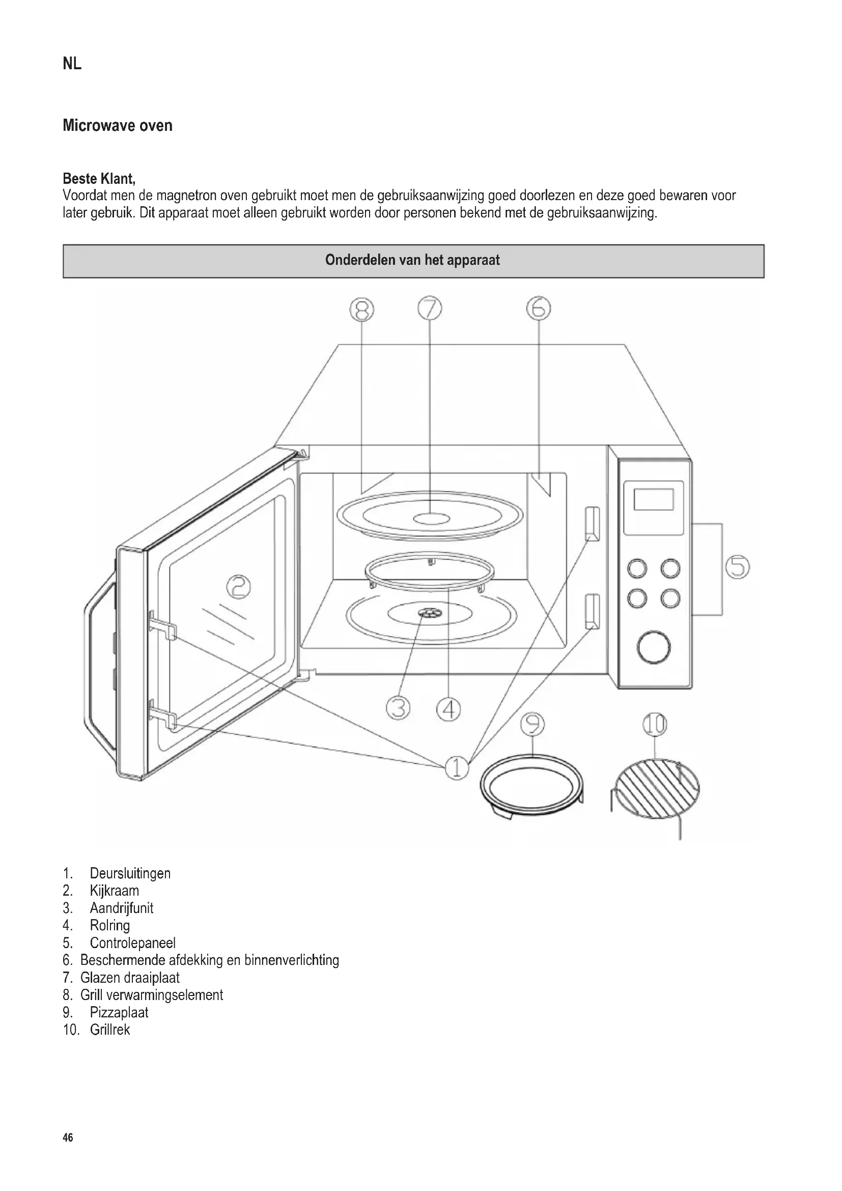 Let op: De buitenkant van dit apparaat kan zeer heet worden tijdens gebruik. Er kan stoom uitgestoten worden via de ventilatiegaten: gevaar voor verbranding. ∙ Plaats het apparaat nooit op een hete ondergrond of in de buurt van open vuur of brandbare gassen. Zorg dat het snoer niet in aanraking komt met een hete ondergrond. Laat het snoer nooit los hangen. ∙ Wanneer de unit niet goed schoongemaakt wordt, zal de kwaliteit van de oppervlakken verminderen, met mogelijk als gevolg een verkorting van de levensduur evenals mogelijk gevaar voor de gebruiker. Alle etensresten moeten51 142 x 208 mm daarom direct verwijderd worden. Voor uitvoerige informatie over het schoonmaken van het apparaat, de paragraaf Schoonmaken raadplegen. ∙ Dit apparaat is bestemd voor huishoudelijk of gelijkwaardig gebruik, zoals - in bedrijfskeukens, in winkels, kantoren of andere bedrijfsruimtes, - in agrarische instellingen, - door klanten in hotels, motels enz. en gelijkwaardige accommodaties, - in bed and breakfast gasthuizen. ∙ Pas op: Ieder onderhoud- of reparatiewerk dat aan de combimagnetron gedaan wordt waarbij men de beschermende platen moet verwijderen, is zeer gevaarlijk voor ongetrainde personen. Dit is inclusief de vernieuwing van het speciale snoer of het verwisselen van de lamp binnenin. De magnetron mag nooit opengeschroefd worden behalve door getraind personeel. Indien dit apparaat kapot is, stuur het dan op aan de klantenservice van de fabrikant. Het adres staat vermeld op de garantiekaart. ∙ Wanneer men vloeistoffen opwarmt in de combimagnetron kan de vloeistof het kookpunt bereiken zonder dat dit zichtbaar wordt. Het is daarom erg belangrijk dat men zeer voorzichtig is met het aanpakken van bakjes tijdens het verwijderen ervan uit het apparaat. Om overkoken te voorkomen, kan men een hittebestendige glazen staaf in een bakje plaatsen tijdens het verhittingsproces. ∙ Eieren in hun schaal of heel hard gekookte eieren mag men nooit in de combimagnetron opwarmen. Er is een grote kans dat deze exploderen zelfs als het opwarmingsproces al klaar is. ∙ Pas op: Het is ook zeer gevaarlijk om vloeistoffen of vast voedsel op te warmen in afgesloten bakjes omdat ook hier het gevaar voor explosie zeer groot is. ∙ De inhoud van babyessen of van glazen potjes met babyvoedsel moet goed geroerd of geschud worden om ervoor te zorgen dat de warmte gelijkmatig verdeeld wordt. Waarschuwing: Om pijn en gevaarlijke verbranding te voorkomen, moet men altijd eerst de temperatuur controleren voordat men het kind het eten geeft. ∙ Wanneer men voedsel opwarmt of kookt dat verpakt is in brandbare materialen zoals plastic of papier, dan bestaat er gevaar dat deze materialen ontbranden. Het is tevens mogelijk dat voedsel uitdroogt of ontbrandt wanneer de gekozen kooktijd te lang is. Vet en olie zijn ook zeer brandbare stoffen. Het is daarom zeer belangrijk om bij het apparaat te blijven wanneer het in gebruik is. Zeer brandbare stoffen zoals geconcentreerde alcohol mogen natuurlijk nooit verhit worden. ∙ Wanneer er rook zichtbaar is tijdens gebruik, moet men de deur gesloten houden om eventuele vlammen te doven. Schakel het apparaat onmiddellijk uit en haal de stekker uit het stopcontact.52 142 x 208 mm ∙ Om gevaar van verbranding te voorkomen moet men altijd een pannenlap gebruiken wanneer men voedsel uit de magnetron verwijderd. Keukengerei zal niet alleen heet worden tijdens gebruik van de grill- en hete lucht functies maar ook tijdens gebruik van de magnetron. ∙ Speciale voedselthermometers (zoals gebruikt in gewone bakovens) zijn niet geschikt voor gebruik in magnetrons. Voor het eerste gebruik ∙ Controleer na het uitpakken en elke keer wanneer men het apparaat aansluit op het stopcontact, het apparaat en het snoer op eventuele beschadigingen. ∙ Let op: Zorg ervoor dat de deur (inclusief het kijkvenster, de deurafdichting en de deursluitingen) niet beschadigd of verbogen zijn en sluit de deur stevig in het deurframe. Dit is belangrijk om te voorkomen dat er geen microgolven vrijkomen tijdens het gebruik. Tevens moet men om dezelfde redenen de behuizing van buiten en van binnen controleren. In geval van schade dit apparaat niet gebruiken totdat het gerepareerd is door een gekwaliceerde monteur. ∙ Verwijder alle externe, interne verpakkingsmaterialen en stickers. Al deze materialen zijn geschikt voor recycling. ∙ Verwijder nooit de zelfklevende, beschermende folie aan de binnenkant van de deur, aan de rolring/aandrijfunit, of de grijsbruine afdekking (6) naast de verlichting aan de rechterkant van het interieur. ∙ Waarschuwing: Houdt kinderen weg van inpakmateriaal, daar deze een bron van gevaar zijn bv. door verstikking. ∙ Voordat men het apparaat voor het eerst gebruikt of wanneer men het apparaat voor lange periode niet gebruikt heeft, moet men deze eerst goed schoonmaken zoals staat beschreven in de paragraaf Schoonmaken. ∙ Installeer de rolring/aandrijfunit en de glazen draaiplaat in de unit. ∙ Gebruik dit apparaat nooit zonder de rolring/aandrijfunit en de glazen draaiplateau juist geplaats zijn. ∙ Laat voordat men de combimagnetron gebruikt, het apparaat ongeveer 10 minuten opwarmen op de grillstand (zonder dat de magnetronfunctie geactiveerd is). Dit doet de geur verwijderen die normaal aanwezig is, wanneer men de grill voor de eerste keer gebruikt. Een kleine hoeveelheid rook zal zichtbaar zijn. Dit is normaal, maar zorg voor voldoende ventilatie. ∙ Dit apparaat is een groep 2 klasse B ISM devies. Groep 2 bevat alle ISM divisies (industrieel, wetenschappelijk, medisch) welke radio energie golven gebruiken en/of radio energie golven afgeven in de vorm van elektromagnetische radiatie om materialen te bewerken; het bevat ook een vonk erosie devies. Klasse B speciceert een devies ontworpen voor huishoudelijk gebruik, of ieder gelijkwaardig devies aangesloten op het stroomnet wat huishoudelijke units voorziet. Let op: Schakel het apparaat nooit aan tenzij het voedsel dat men wil 