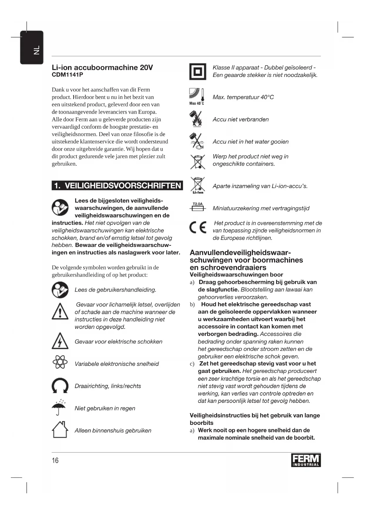 Li-ion accuboormachine 20V CDM1141P Dank u voor het aanschaffen van dit Ferm product. Hierdoor bent u nu in het bezit van een uitstekend product, geleverd door een van de toonaangevende leveranciers van Europa. Alle door Ferm aan u geleverde producten zijn vervaardigd conform de hoogste prestatie- en veiligheidsnormen. Deel van onze filosofie is de uitstekende klantenservice die wordt ondersteund door onze uitgebreide garantie. Wij hopen dat u dit product gedurende vele jaren met plezier zult gebruiken.