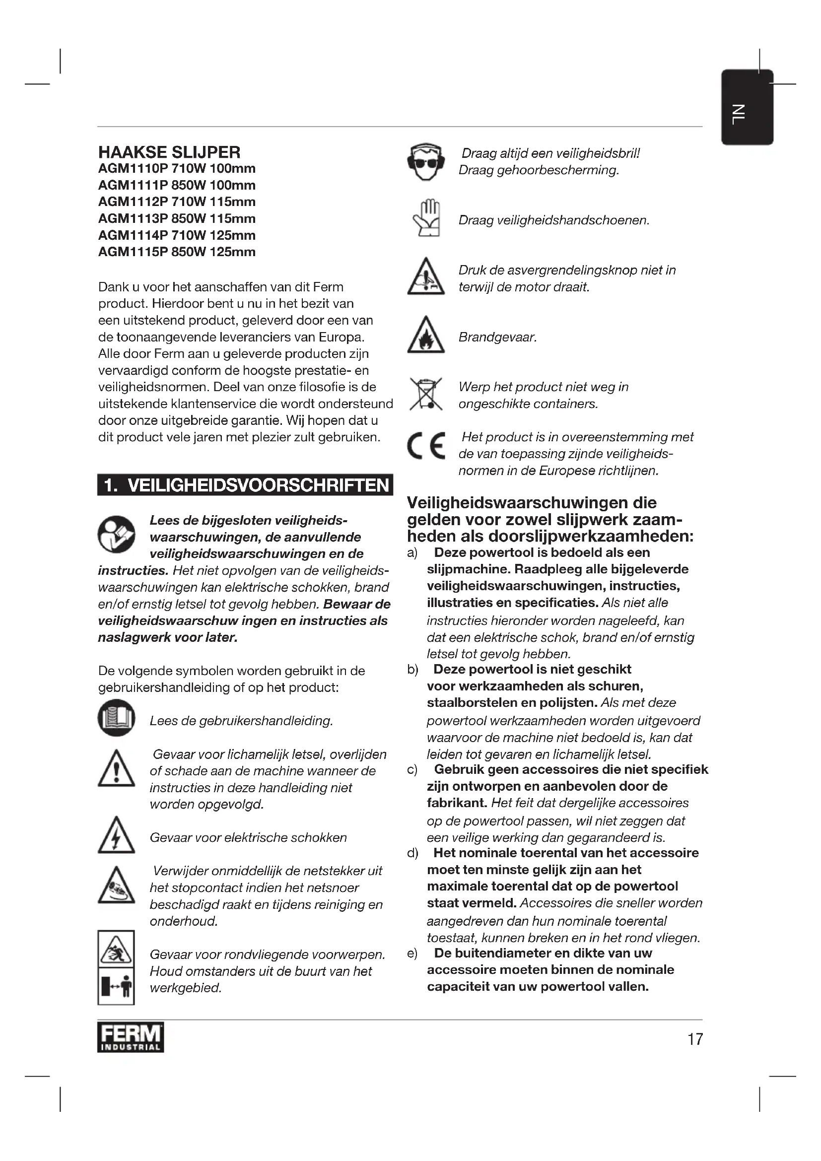 HAAKSE SLIJPER AGM1110P 710W 100mm AGM1111P 850W 100mm AGM1112P 710W 115mm AGM1113P 850W 115mm AGM1114P 710W 125mm AGM1115P 850W 125mm Dank u voor het aanschaffen van dit Ferm product. Hierdoor bent u nu in het bezit van een uitstekend product, geleverd door een van de toonaangevende leveranciers van Europa. Alle door Ferm aan u geleverde producten zijn vervaardigd conform de hoogste prestatie- en veiligheidsnormen. Deel van onze filosofie is de uitstekende klantenservice die wordt ondersteund door onze uitgebreide garantie. Wij hopen dat u dit product vele jaren met plezier zult gebruiken.