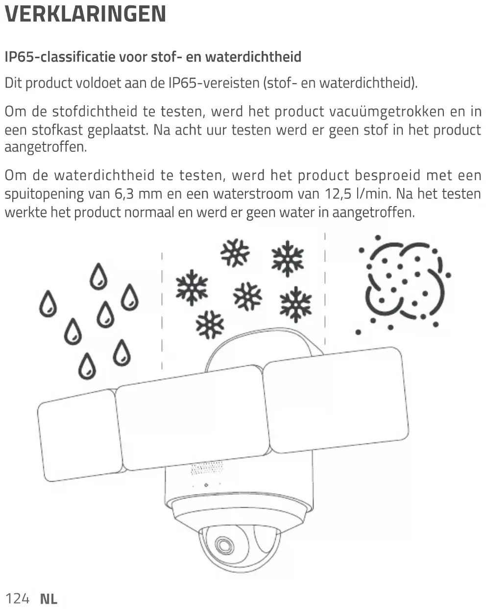 VERKLARINGEN IP65-classificatie voor stof- en waterdichtheid Dit product voldoet aan de IP65-vereisten (stof- en waterdichtheid). Om de stofdichtheid te testen, werd het product vacuümgetrokken en in een stofkast geplaatst. Na acht uur testen werd er geen stof in het product aangetroffen. Om de waterdichtheid te testen, werd het product besproeid met een spuitopening van 6,3 mm en een waterstroom van 12,5 l/min. Na het testen werkte het product normaal en werd er geen water in aangetroffen.NL