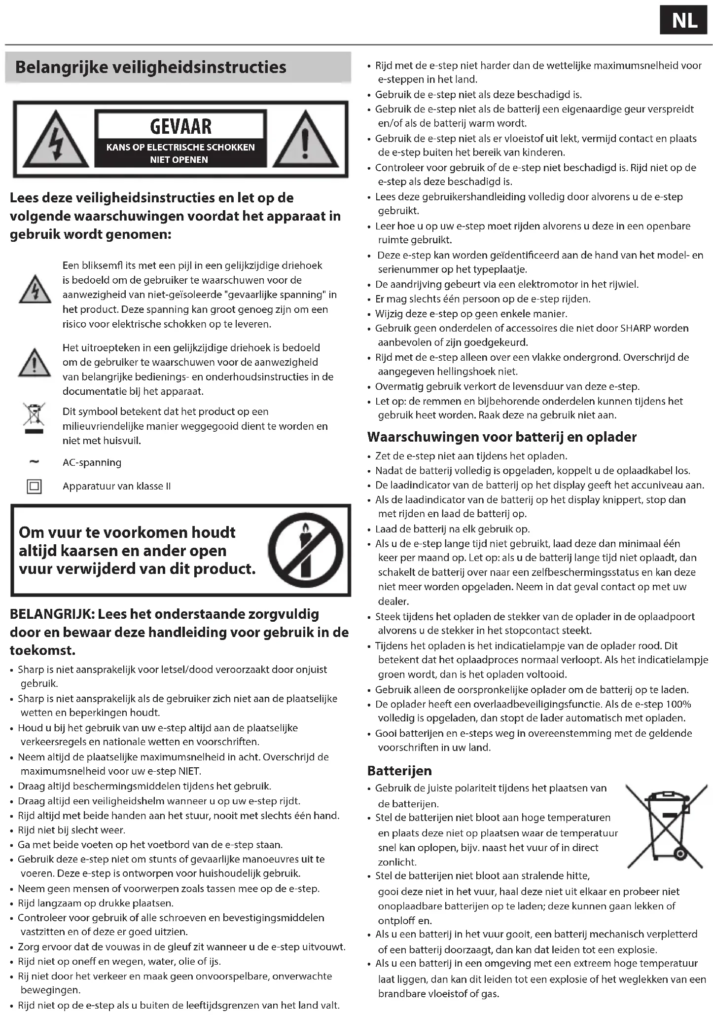 - Sharp is niet aansprakelijk voor letsel/dood veroorzaakt door onjuist gebruik.• Sharp is niet aansprakelijk als de gebruiker zich niet aan de plaatselijke wetten en beperkingen houdt.• Houd u bij het gebruik van uw e-step altijd aan de plaatselijke verkeersregels en nationale wetten en voorschriften.• Neem altijd de plaatselijke maximumsnelheid in acht. Overschrijd de maximumsnelheid voor uw e-step NIET.• Draag altijd beschermingsmiddelen tijdens het gebruik.• Draag altijd een veiligheidshelm wanneer u op uw e-step rijdt.• Rijd altijd met beide handen aan het stuur, nooit met slechts één hand.• Rijd niet bij slecht weer.• Ga met beide voeten op het voetbord van de e-step staan.• Gebruik deze e-step niet om stunts of gevaarlijke manoeuvres uit te voeren. Deze e-step is ontworpen voor huishoudelijk gebruik.• Neem geen mensen of voorwerpen zoals tassen mee op de e-step.• Rijd langzaam op drukke plaatsen.• Controleer voor gebruik of alle schroeven en bevestigingsmiddelen vastzitten en of deze er goed uitzien.• Zorg ervoor dat de vouwas in de gleuf zit wanneer u de e-step uitvouwt.• Rijd niet op one en wegen, water, olie of ijs.• Rij niet door het verkeer en maak geen onvoorspelbare, onverwachte bewegingen.• Rijd niet op de e-step als u buiten de leeftijdsgrenzen van het land valt.• Rijd met de e-step niet harder dan de wettelijke maximumsnelheid voor e-steppen in het land.• Gebruik de e-step niet als deze beschadigd is.• Gebruik de e-step niet als de batterij een eigenaardige geur verspreidt en/of als de batterij warm wordt.• Gebruik de e-step niet als er vloeistof uit lekt, vermijd contact en plaats de e-step buiten het bereik van kinderen.• Controleer voor gebruik of de e-step niet beschadigd is. Rijd niet op de e-step als deze beschadigd is.• Lees deze gebruikershandleiding volledig door alvorens u de e-step gebruikt.• Leer hoe u op uw e-step moet rijden alvorens u deze in een openbare ruimte gebruikt.