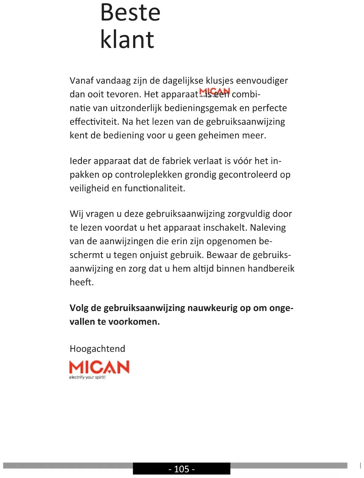 - directive RoHS 2011/65/CE et c’est le pourquoi le produit est désigné par le symbol ainsi qu’une déclaration de la conformité accessible aux organes chargés de la surveillance du marché a été délivrée.- 105 - Beste klant Vanaf vandaag zijn de dagelijkse klusjes eenvoudiger dan ooit tevoren. Het apparaat is een combi- nae van uitzonderlijk bedieningsgemak en perfecte eecviteit. Na het lezen van de gebruiksaanwijzing kent de bediening voor u geen geheimen meer. Ieder apparaat dat de fabriek verlaat is vóór het in- pakken op controleplekken grondig gecontroleerd op veiligheid en funconaliteit. Wij vragen u deze gebruiksaanwijzing zorgvuldig door te lezen voordat u het apparaat inschakelt. Naleving van de aanwijzingen die erin zijn opgenomen be- schermt u tegen onjuist gebruik. Bewaar de gebruiks- aanwijzing en zorg dat u hem aljd binnen handbereik hee. Volg de gebruiksaanwijzing nauwkeurig op om onge- vallen te voorkomen. Hoogachtend- 106 - VOORZORGSMAATREGELEN