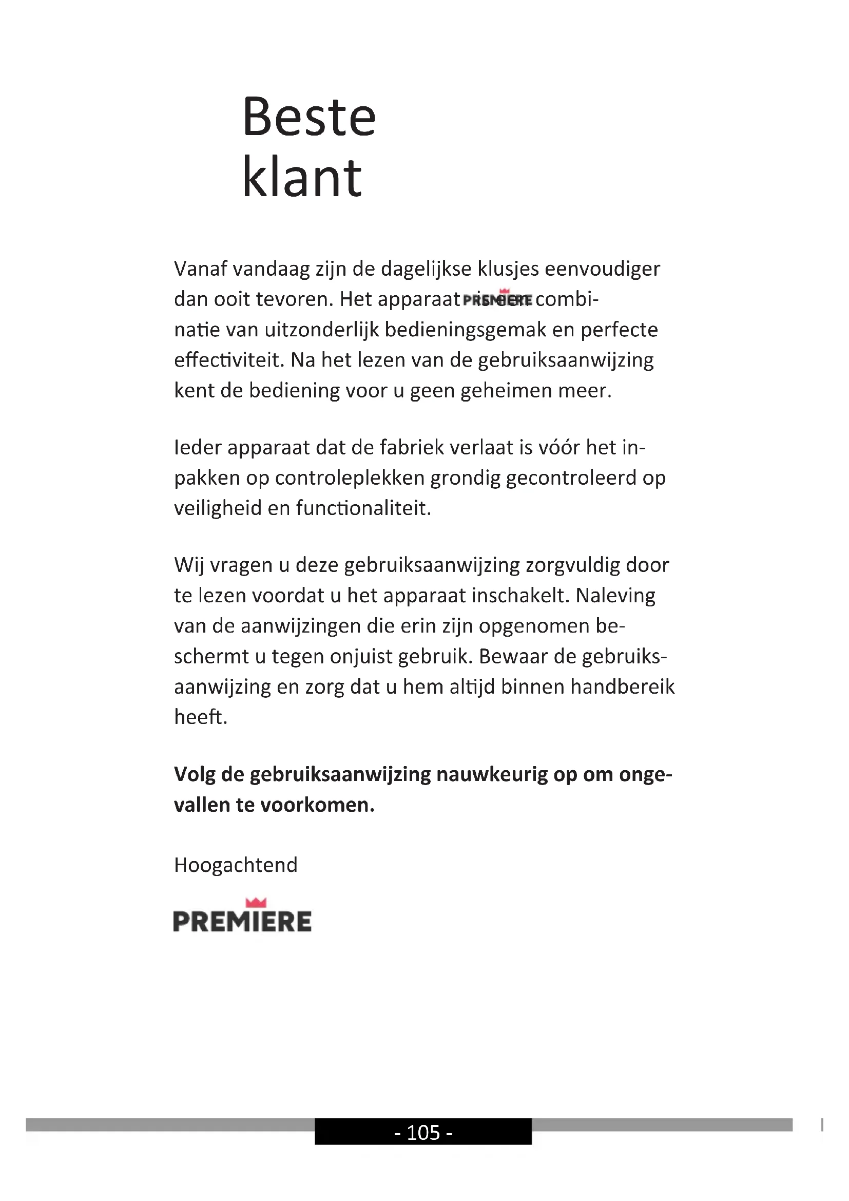 - directive RoHS 2011/65/CE et c’est le pourquoi le produit est désigné par le symbol ainsi qu’une déclaration de la conformité accessible aux organes chargés de la surveillance du marché a été délivrée.- 105 - Beste klant Vanaf vandaag zijn de dagelijkse klusjes eenvoudiger dan ooit tevoren. Het apparaat is een combi- nae van uitzonderlijk bedieningsgemak en perfecte eecviteit. Na het lezen van de gebruiksaanwijzing kent de bediening voor u geen geheimen meer. Ieder apparaat dat de fabriek verlaat is vóór het in- pakken op controleplekken grondig gecontroleerd op veiligheid en funconaliteit. Wij vragen u deze gebruiksaanwijzing zorgvuldig door te lezen voordat u het apparaat inschakelt. Naleving van de aanwijzingen die erin zijn opgenomen be- schermt u tegen onjuist gebruik. Bewaar de gebruiks- aanwijzing en zorg dat u hem aljd binnen handbereik hee. Volg de gebruiksaanwijzing nauwkeurig op om onge- vallen te voorkomen. Hoogachtend- 106 - VOORZORGSMAATREGELEN
