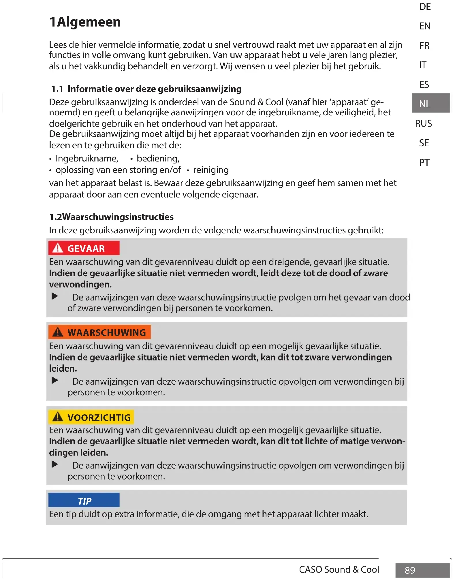 In deze gebruiksaanwijzing worden de volgende waarschuwingsinstructies gebruikt: GEVAAR Een waarschuwing van dit gevarenniveau duidt op een dreigende, gevaarlijke situatie. Indien de gevaarlijke situatie niet vermeden wordt, leidt deze tot de dood of zware verwondingen. De aanwijzingen van deze waarschuwingsinstructie pvolgen om het gevaar van dood of zware verwondingen bij personen te voorkomen. WAARSCHUWING Een waarschuwing van dit gevarenniveau duidt op een mogelijk gevaarlijke situatie. Indien de gevaarlijke situatie niet vermeden wordt, kan dit tot zware verwondingen leiden. De aanwijzingen van deze waarschuwingsinstructie opvolgen om verwondingen bij personen te voorkomen. VOORZICHTIG Een waarschuwing van dit gevarenniveau duidt op een mogelijk gevaarlijke situatie. Indien de gevaarlijke situatie niet vermeden wordt, kan dit tot lichte of matige verwon- dingen leiden. De aanwijzingen van deze waarschuwingsinstructie opvolgen om verwondingen bij personen te voorkomen. Een tip duidt op extra informatie, die de omgang met het apparaat lichter maakt. TIPCASO Sound & Cool