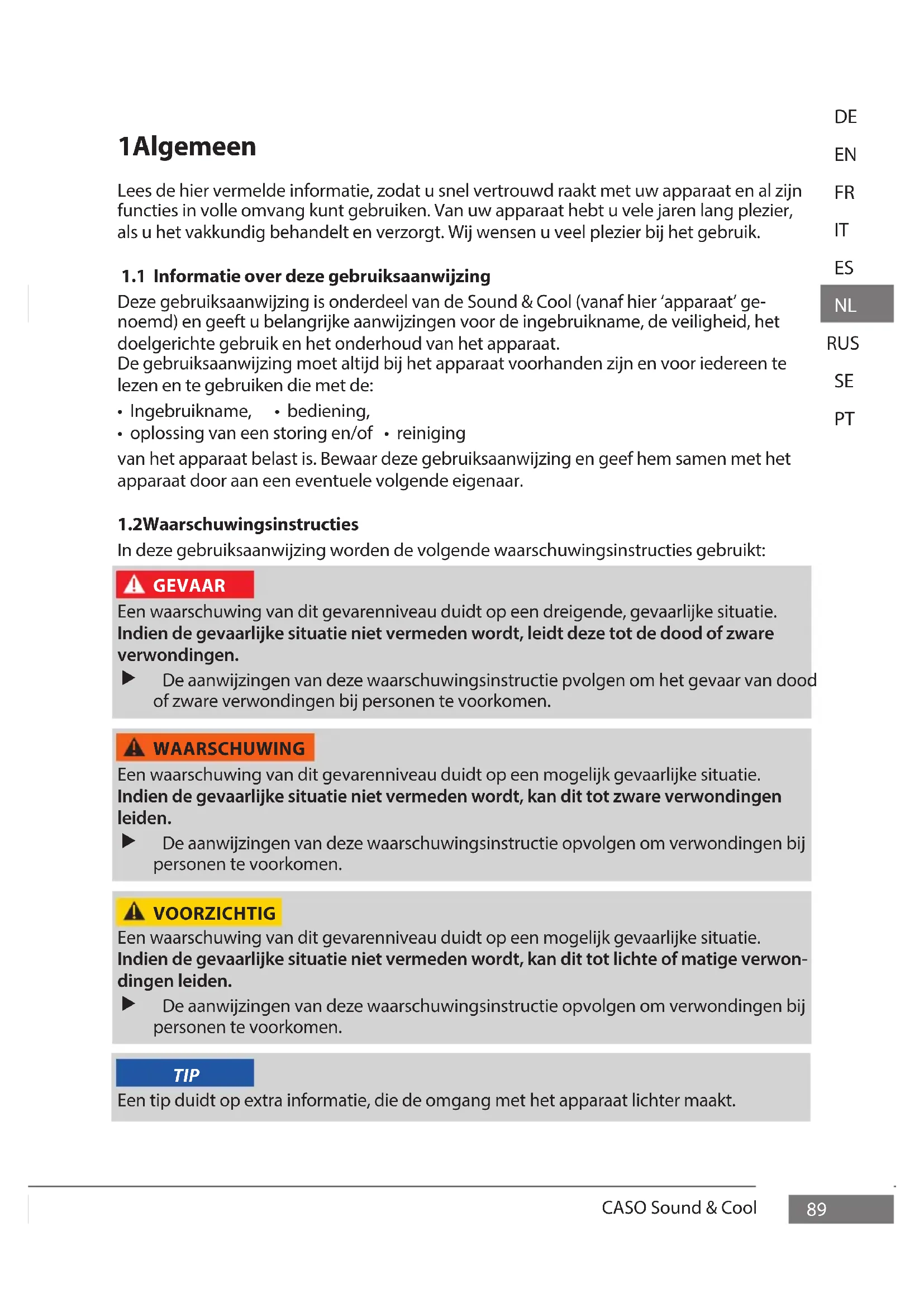 In deze gebruiksaanwijzing worden de volgende waarschuwingsinstructies gebruikt: GEVAAR Een waarschuwing van dit gevarenniveau duidt op een dreigende, gevaarlijke situatie. Indien de gevaarlijke situatie niet vermeden wordt, leidt deze tot de dood of zware verwondingen. De aanwijzingen van deze waarschuwingsinstructie pvolgen om het gevaar van dood of zware verwondingen bij personen te voorkomen. WAARSCHUWING Een waarschuwing van dit gevarenniveau duidt op een mogelijk gevaarlijke situatie. Indien de gevaarlijke situatie niet vermeden wordt, kan dit tot zware verwondingen leiden. De aanwijzingen van deze waarschuwingsinstructie opvolgen om verwondingen bij personen te voorkomen. VOORZICHTIG Een waarschuwing van dit gevarenniveau duidt op een mogelijk gevaarlijke situatie. Indien de gevaarlijke situatie niet vermeden wordt, kan dit tot lichte of matige verwon- dingen leiden. De aanwijzingen van deze waarschuwingsinstructie opvolgen om verwondingen bij personen te voorkomen. Een tip duidt op extra informatie, die de omgang met het apparaat lichter maakt. TIPCASO Sound & Cool